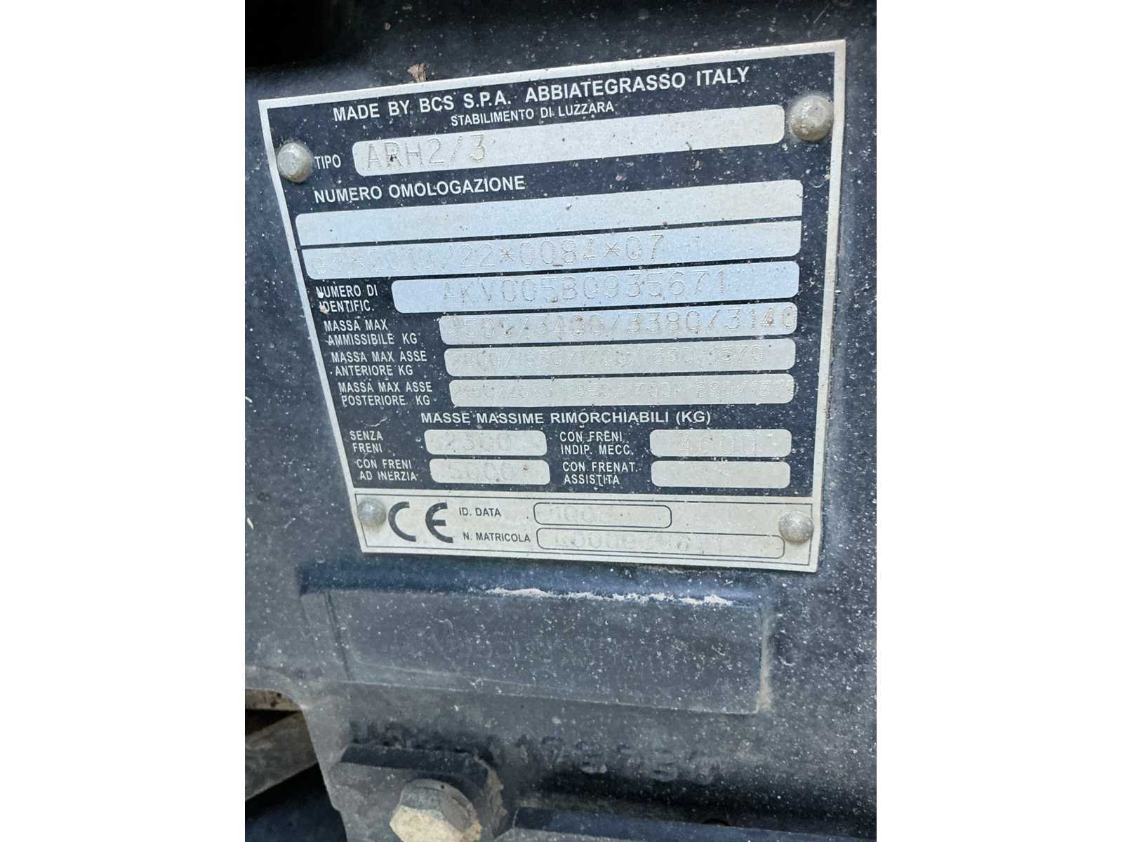 Inschrijvingsbewijs aanwezig, gelijkvormigheidsattest aanwezig Merk: BCS Type: Volcan K 105 ARH2/3 Serienummer: AKV005B0935671 Motorvermogen (kW): 72.1kW Afgelezen urenstand: 2043 Bandenmaat voor: 340/65R20 Bandenmaat achter: 340/65R20 Datum eerste toelating: 16/08/2017