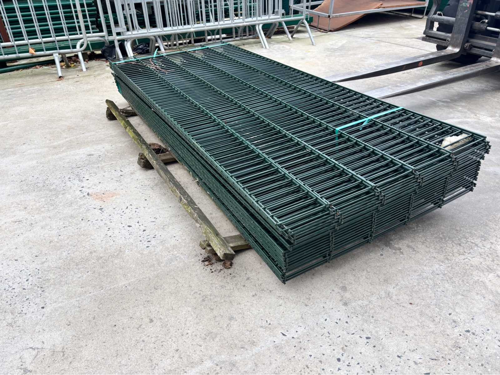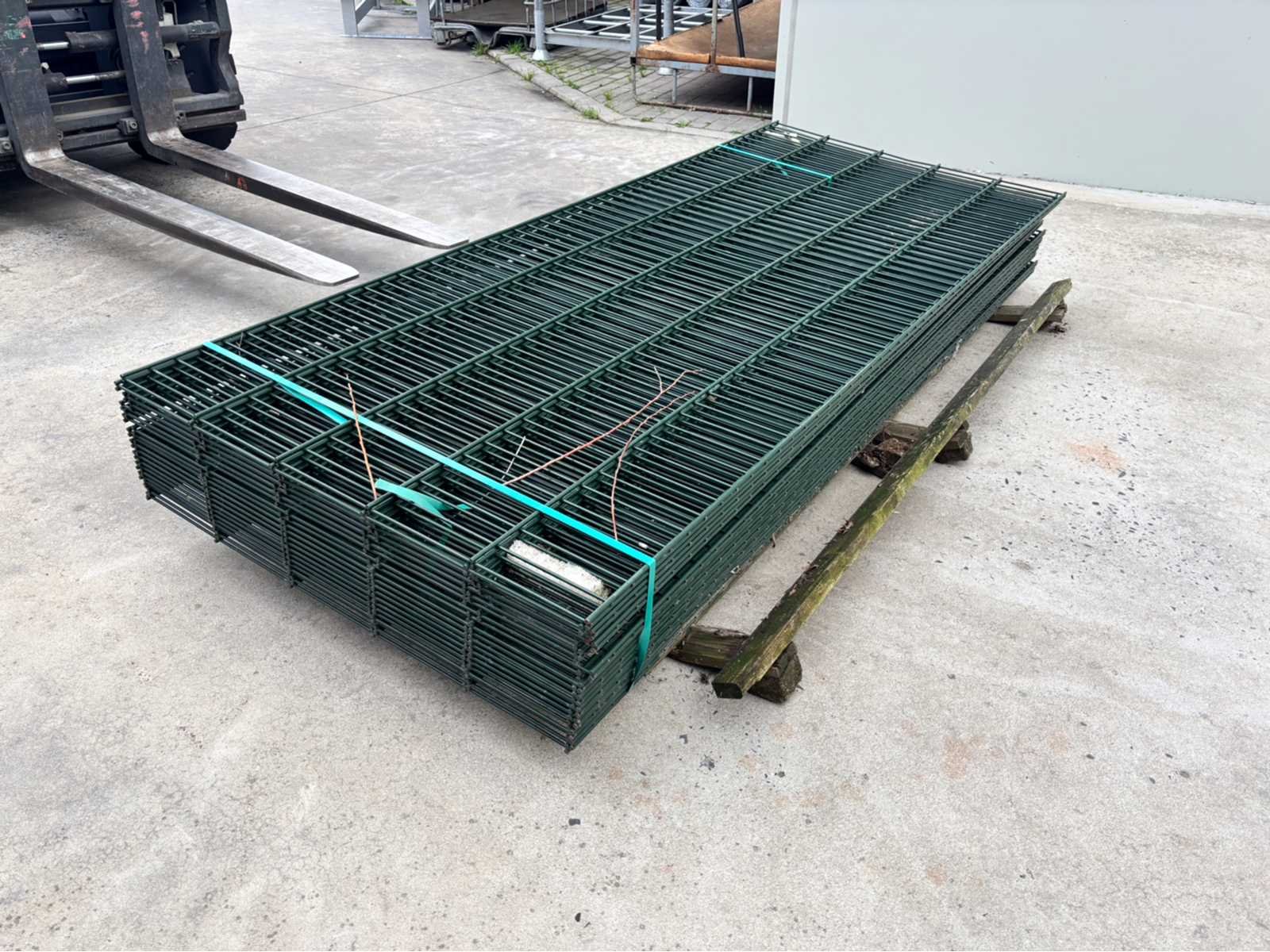 Conditie ongebruikt; lot van 55m omheining; 22 draadpanelen; panlen kunnen lichte beschadiging hebben; Merk: Europees fabrikaat Model: Dubbeldraadpanelen Product type: 8/6/8mm Kleur: Donker groen RAL6009 Gewicht: 450kg Breedte: 250cm Hoogte: 100cm Materiaal: Gegalvaniseerd en gecoat