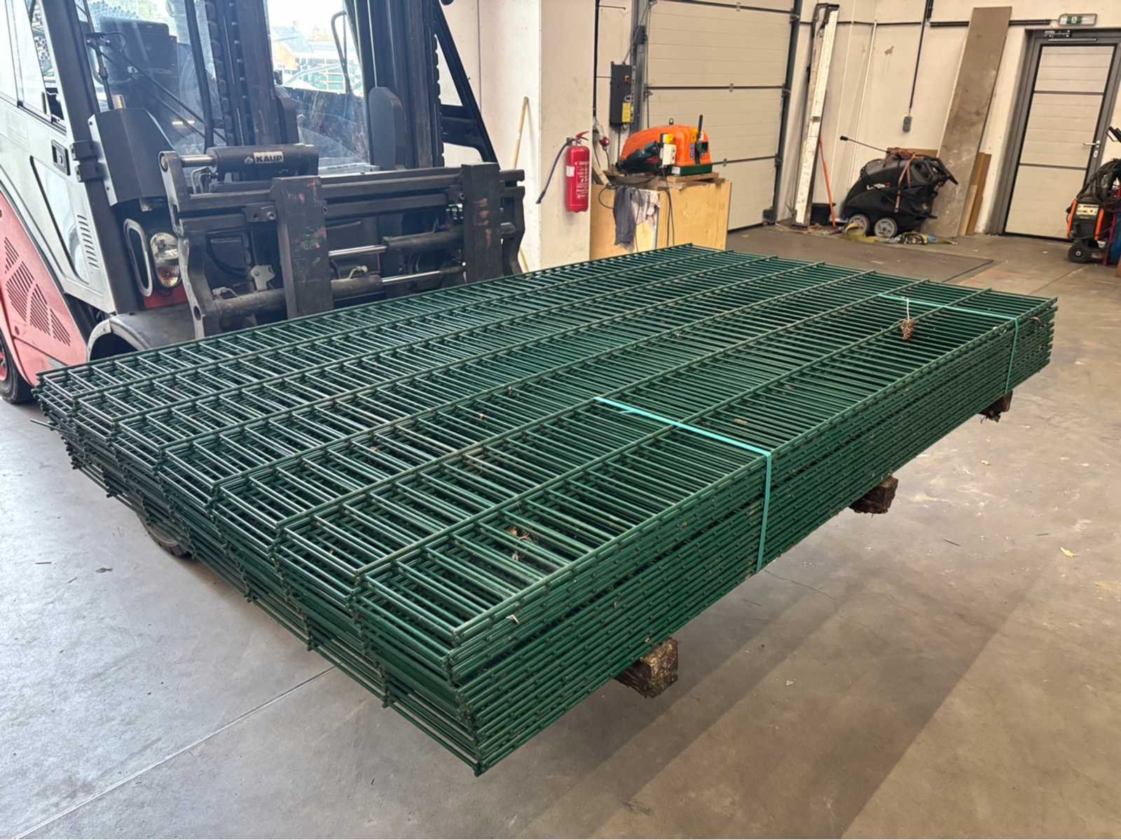 Conditie ongebruikt; lot van 50m omheining; 20 draadpanelen; panelen kunnen lichte beschadiging hebben; 21 palen lengte 2m; 50 bevestigingen Merk: Europees fabrikaat Model: Dubbeldraadpanelen Product type: 8/6/8mm Kleur: groen RAL6005 Gewicht: 600kg Breedte: 250cm Hoogte: 140cm Materiaal: Gegalvaniseerd en gecoat