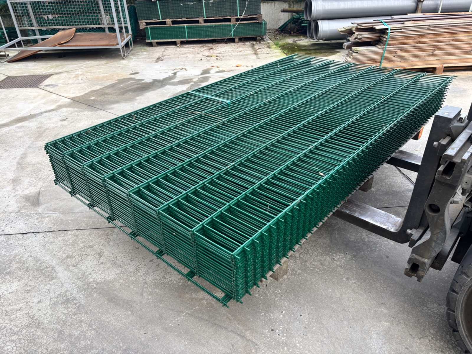 Conditie ongebruikt; lot van 40m omheining; 16 draadpanelen; met 17 palen lengte 2m; 50 bevestigingnen; panelen kunnen lichte beschadiging hebben; Merk: Europees fabrikaat Model: Dubbeldraadpanelen Product type: 8/6/8mm Kleur: groen RAL6005 en grijs RAL7016 Gewicht: 550kg Breedte: 250cm Hoogte: 140cm Materiaal: Gegalvaniseerd en gecoat