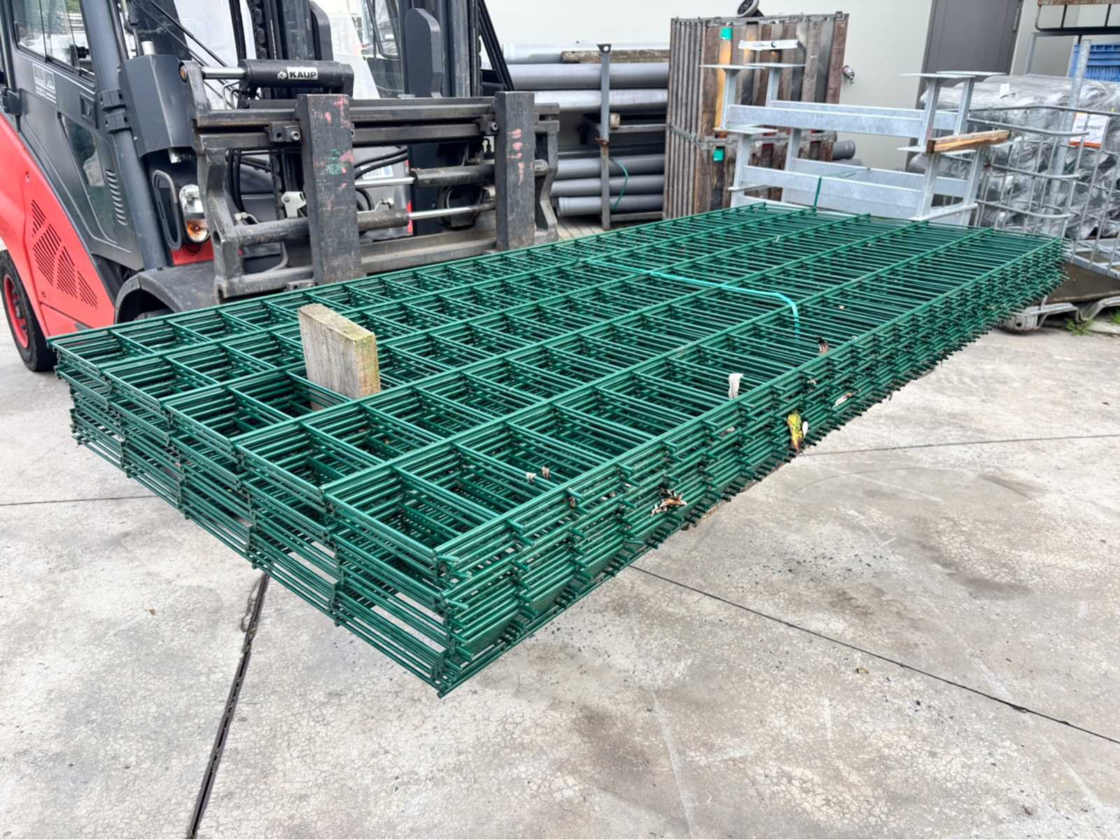 Conditie ongebruikt; lot van 40m omheining; 16 draadpanelen; met 16 palen lengte 2m; 50 bevestigingnen; panelen kunnen lichte beschadiging hebben; maaswijdte 100x200mm Merk: Europees fabrikaat Model: Dubbeldraadpanelen Product type: 8/6/8mm Kleur: Groen RAL6005 Gewicht: 200kg Breedte: 250cm Hoogte: 100cm Materiaal: Gegalvaniseerd en gecoat