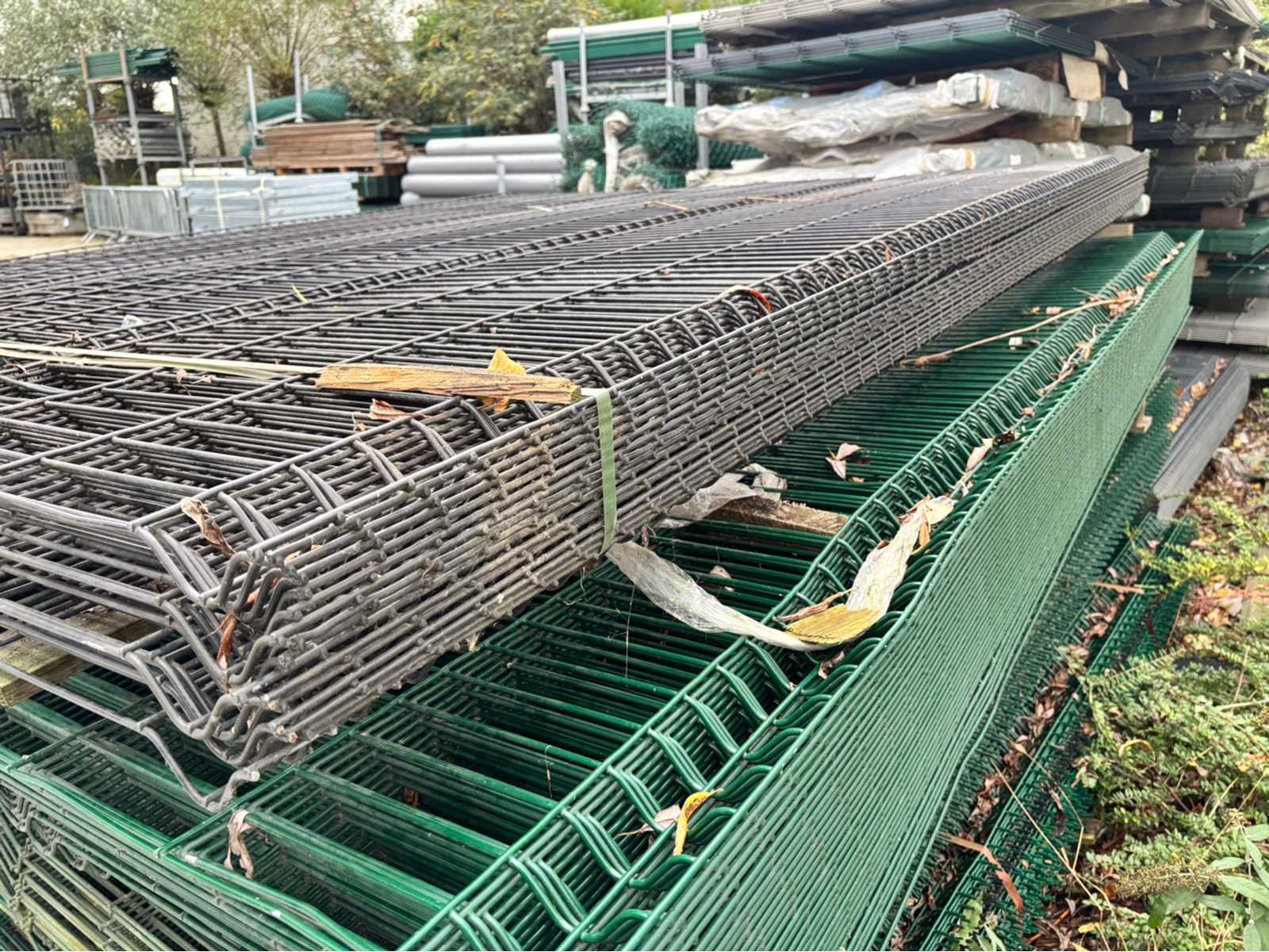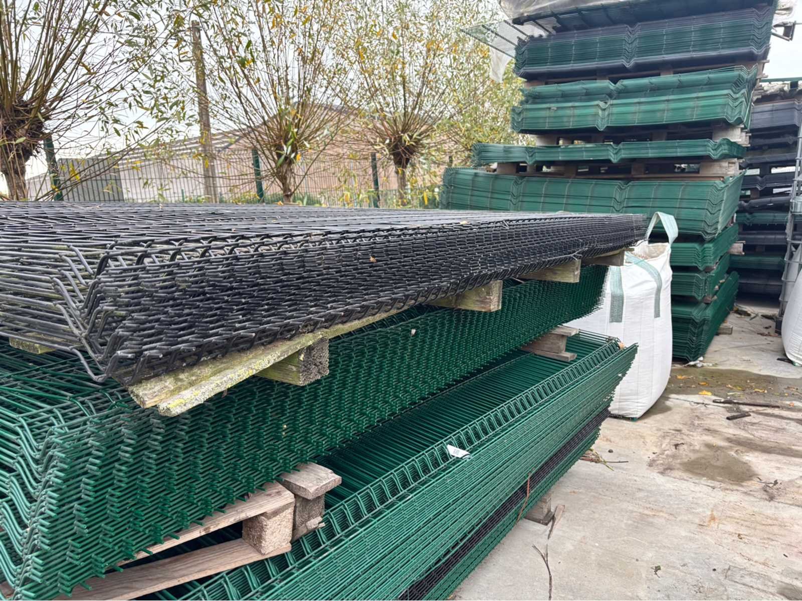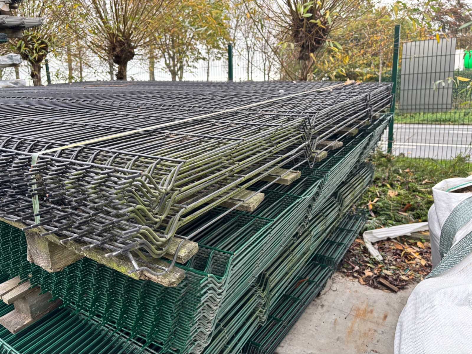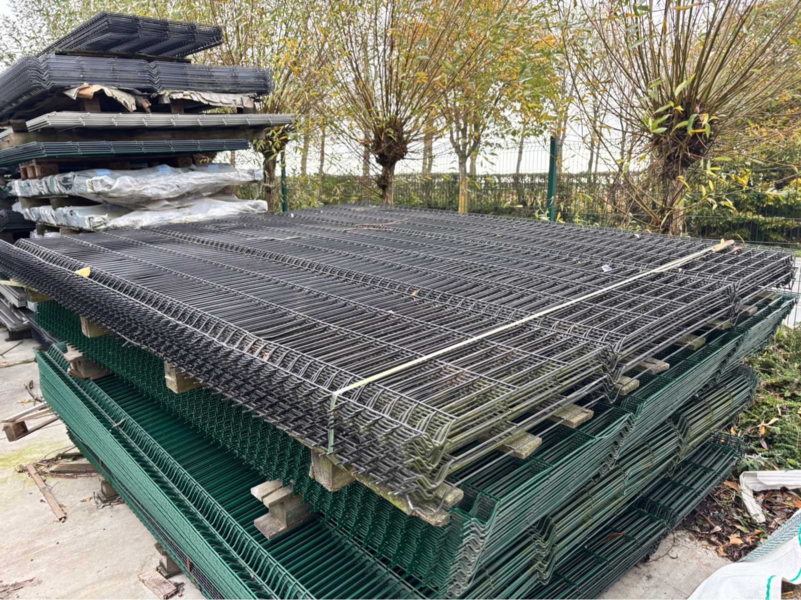 Conditie ongebruikt; lot van 16 panelen met 17 palen lengte 320cm; totale lengte van 57m; 100 bevestigingen; panelen kunnen schade hebben Merk: Europees fabrikaat Model: 3D Product type: 5mm Kleur: Zwart RAL9005 Gewicht: 650kg Breedte: 300cm Hoogte: 240cm Materiaal: Gegalvaniseerd en gecoat