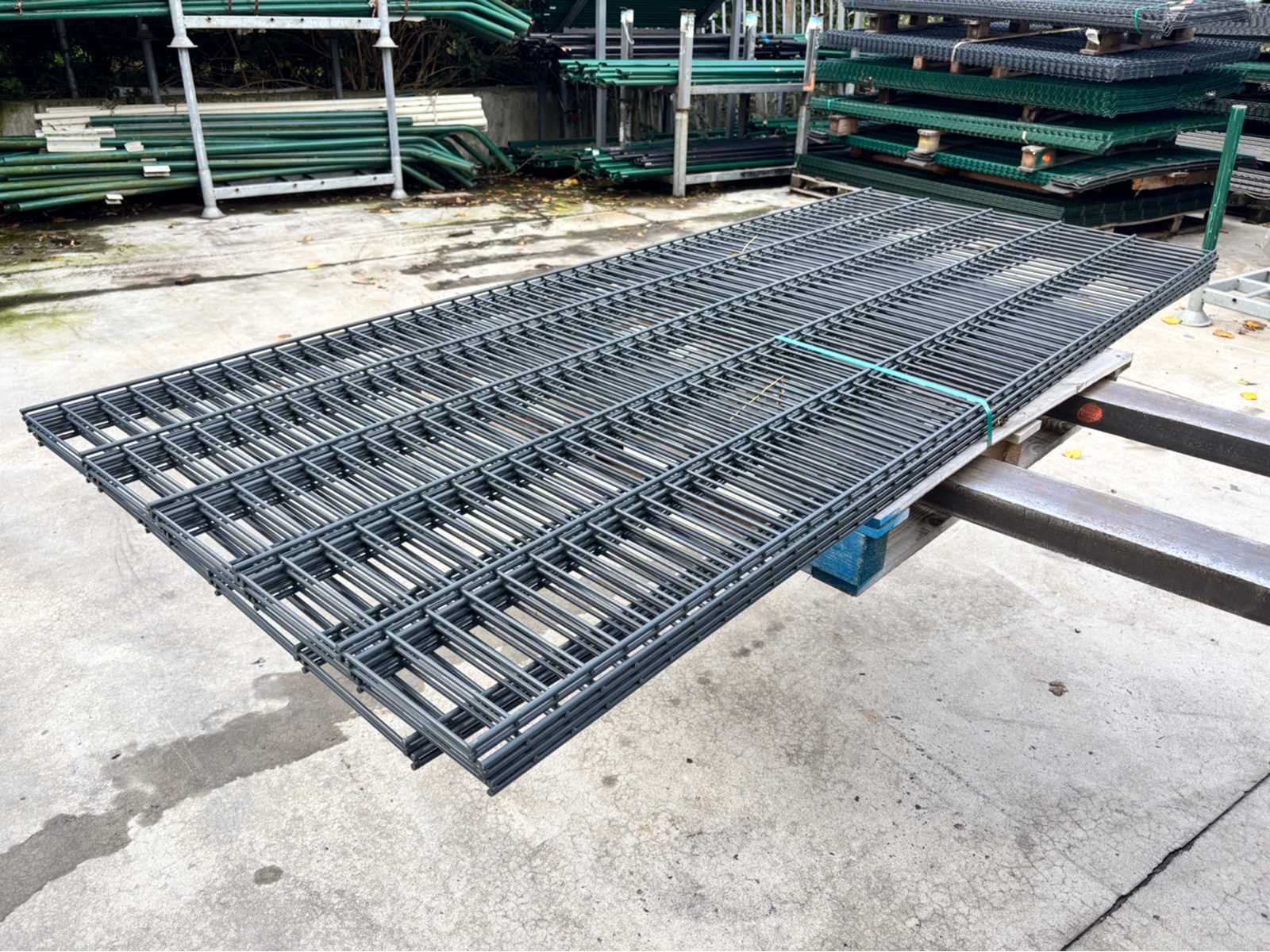 Conditie ongebruikt; lot van 6 panelen; b-keuze Merk: Europees fabrikaat Model: 8/6/8mm Product type: Dubbelstaafmat Kleur: RAL7016 grijs Gewicht: 150kg Breedte: 250cm Hoogte: 100cm Materiaal: Gegalvaniseerd en gecoat