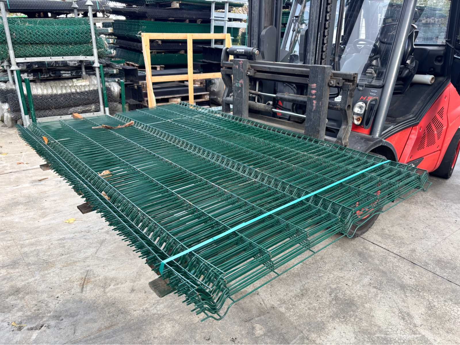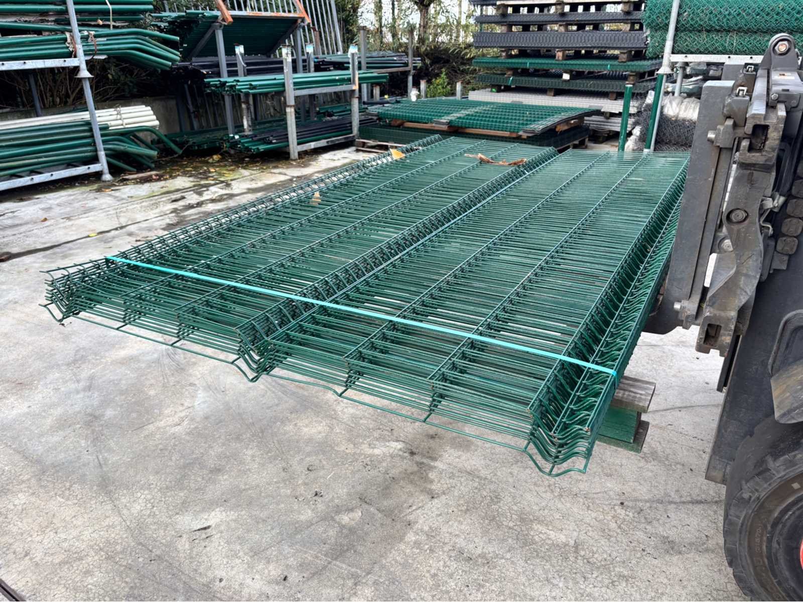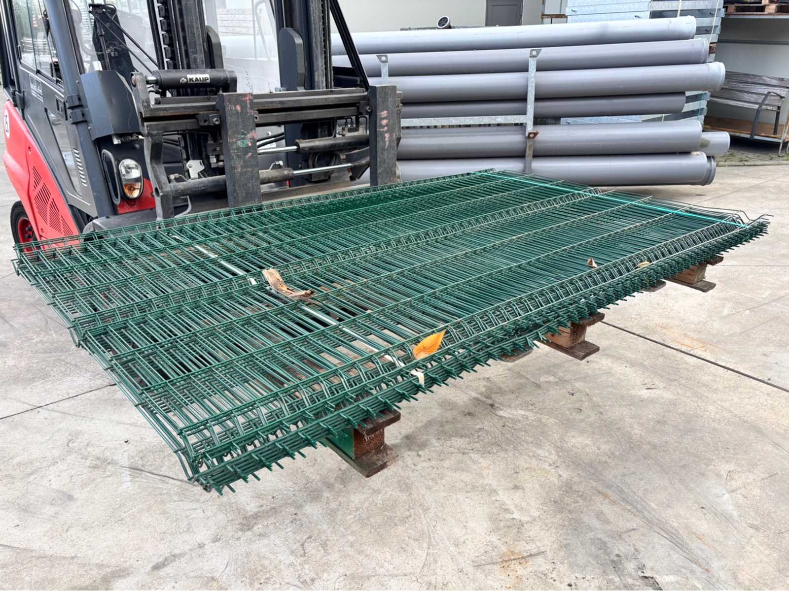 Conditie ongebruikt; lot van 9 panelen met 10 palen lengte 200cm; 30 bevestigingen Merk: Europees fabrikaat Model: 3D Product type: Enkele staafpanelen Kleur: Groen RAL6005 Gewicht: 150kg Breedte: 250cm Hoogte: 150cm Materiaal: Gegalvaniseerd en gecoat