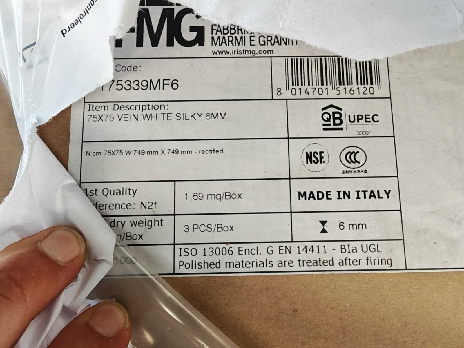 Merk: Iris Kleur: White Afwerking: Silky Lengte: 75mm Breedte: 75mm Dikte: 6mm Materiaal: Keramiek Type: Vloertegel Model: Marmi Veined Aantal m² per verpakking: 1.68m² Aantal pakken: 11 Totaal oppervlakte: 18.48m² Totaal gewicht: 400kg