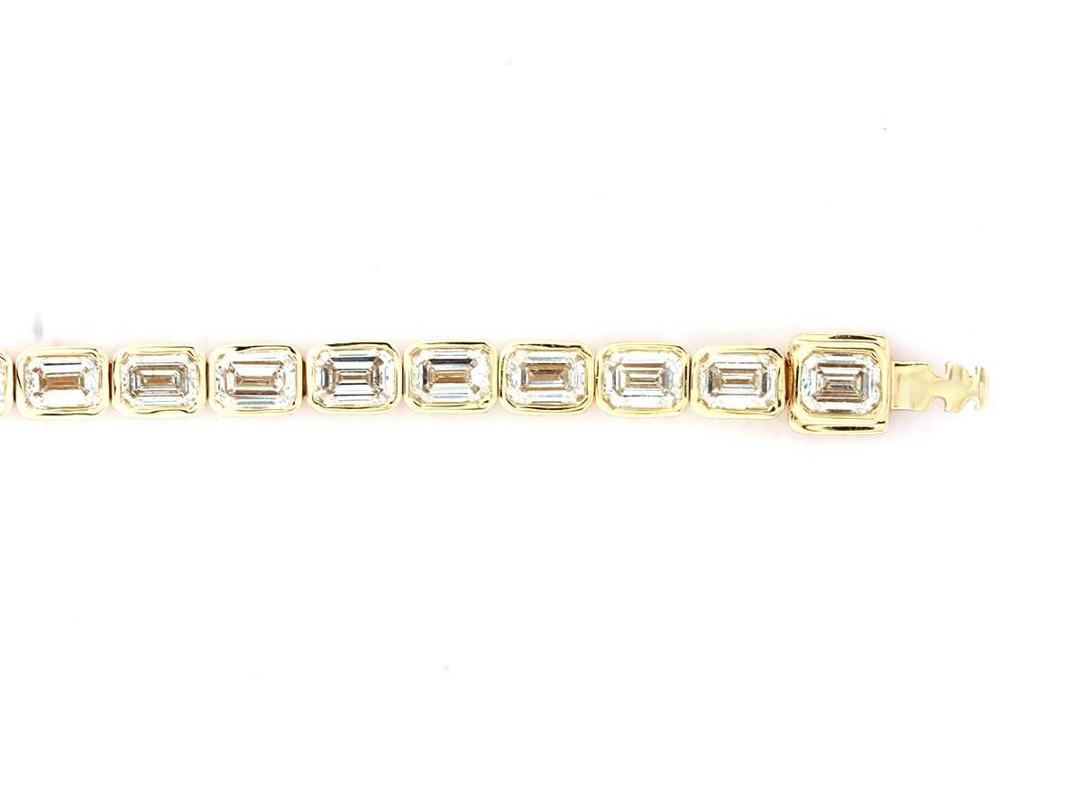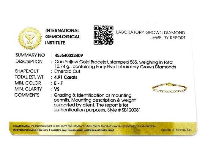 Aantal items-1, Metaal-Goud, Totaal bruto gewicht: 10,74, Voorzien met: Prachtig gekleurde laboratoriumgekweekte diamanten, Aantal diamanten: 45, Totaal karaatgewicht: 4,91, Diamanten Helderheid: VS, Diamantvorm/Slijpvorm: Smaragdslijp, Diamanten Kleur: EF, Conditie: Nieuw, Lengte: 18 cm, Goudzuiverheidskenmerk op het sieradenstuk, Ontwerpcode: SB120081, Verpakking: Sieradendoos met certificaatkaart, Historische Winkelprijs: €8345. Goud is op recordhoogtes. Deze productie bestaat uit nieuwe of ongebruikte sieraden. Het is echter gemaakt tegen een lagere goudprijs dan nu en we verhogen de prijzen niet – de aanbevolen detailhandelsprijzen of geschatte prijzen zijn gebaseerd op HISTORISCHE goudprijzen. Het betekent dat het goud wordt afgeprijsd als je de huidige kosten weerspiegelt. Al onze partijen worden in Fedex-dozen verzonden via High Priority. Je ontvangt een trackingcode kort nadat je hebt betaald voor de veilingkavels. Het wordt meestal binnen 7-14 dagen verzonden en de levering gebeurt daarna binnen 24-48 uur. De kavels zijn verzekerd en vooruitbetaald door de verkoper. Within 14 days Materiaal: Gold Kleur: Yellow gold Voornaamste diamant: ab Grown Diamonds Kleur diamant: EF Gewicht diamant: 4.91ct Zuiverheidsgraad diamant: VS Totaal gewicht: 10.74g