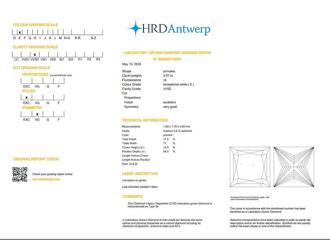 Princess diamant 3.07ct – e/vvs2 – hrd