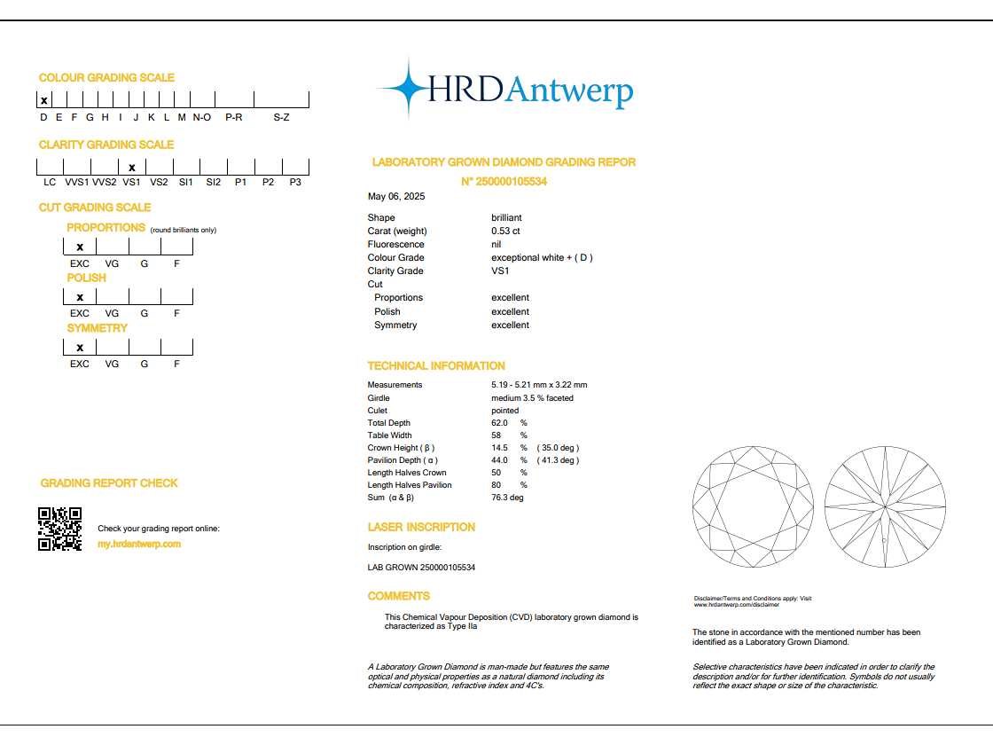 Alle diamanten hebben een gegraveerde laser-inscriptie. De kwaliteit is overgenomen uit het bijhorende certificaat. Bezorgtermijn 3 dagen Datering: 06-05-2025 Karaat: 0.53 Certificaat: 250000105534 Voornaamste diamant: Labgrown Diamant (CVD) Kleur diamant: D Slijpvorm diamant: round Brilliant Slijpkwaliteit diamant: Excellent Zuiverheidsgraad diamant: VS1 Leveringsvoorwaarden: Per koerier