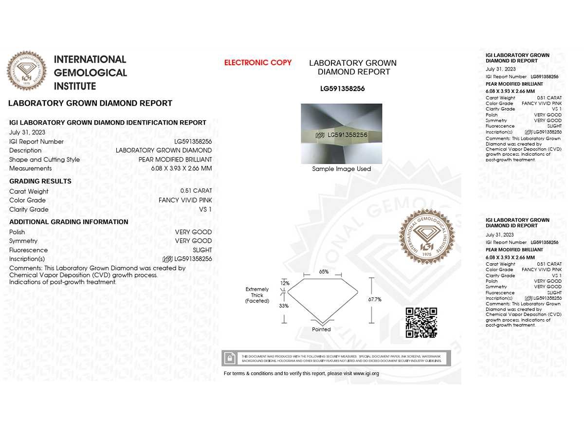 Alle diamanten hebben een gegraveerde laser-inscriptie. De kwaliteit is overgenomen uit het bijhorende certificaat. Bezorgtermijn 3 dagen Datering: 31-07-2023 Karaat: 0.51 Certificaat: LG591358256 Voornaamste diamant: Labgrown Diamant (CVD) Kleur diamant: Fancy Vivid Pink Slijpvorm diamant: Pear Modified Brilliant Zuiverheidsgraad diamant: VS1 Leveringsvoorwaarden: Per koerier