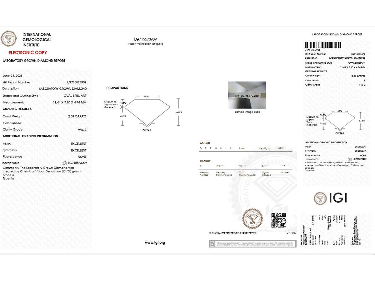 Alle diamanten hebben een gegraveerde laser-inscriptie. De kwaliteit is overgenomen uit het bijhorende certificaat. Bezorgtermijn 3 dagen Datering: 23-06-2026 Karaat: 2.59 Certificaat: LG715573909 Voornaamste diamant: Labgrown Diamant (CVD) Kleur diamant: E Slijpvorm diamant: Oval Brilliant Zuiverheidsgraad diamant: VVS2 Leveringsvoorwaarden: Per koerier