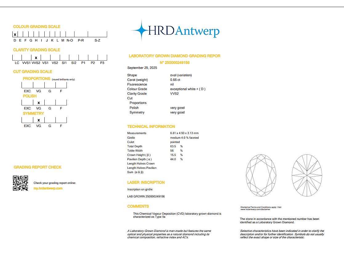 Alle diamanten hebben een gegraveerde laser-inscriptie. De kwaliteit is overgenomen uit het bijhorende certificaat. Bezorgtermijn 3 dagen Datering: 29-09-2025 Karaat: 0.66 Certificaat: 250000249156 Voornaamste diamant: Labgrown Diamant (CVD) Kleur diamant: D Slijpvorm diamant: Oval Zuiverheidsgraad diamant: VVS2 Leveringsvoorwaarden: Per koerier