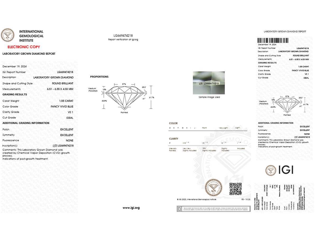 Alle diamanten hebben een gegraveerde laser-inscriptie. De kwaliteit is overgenomen uit het bijhorende certificaat. Bezorgtermijn 3 dagen Datering: 19-12-2024 Karaat: 1.05 Certificaat: LG669474218 Voornaamste diamant: Labgrown diamant (CVD) Kleur diamant: Fancy Vivid Blue Slijpvorm diamant: Round Brilliant Slijpkwaliteit diamant: Excellent Zuiverheidsgraad diamant: VS1 Leveringsvoorwaarden: Per koerier