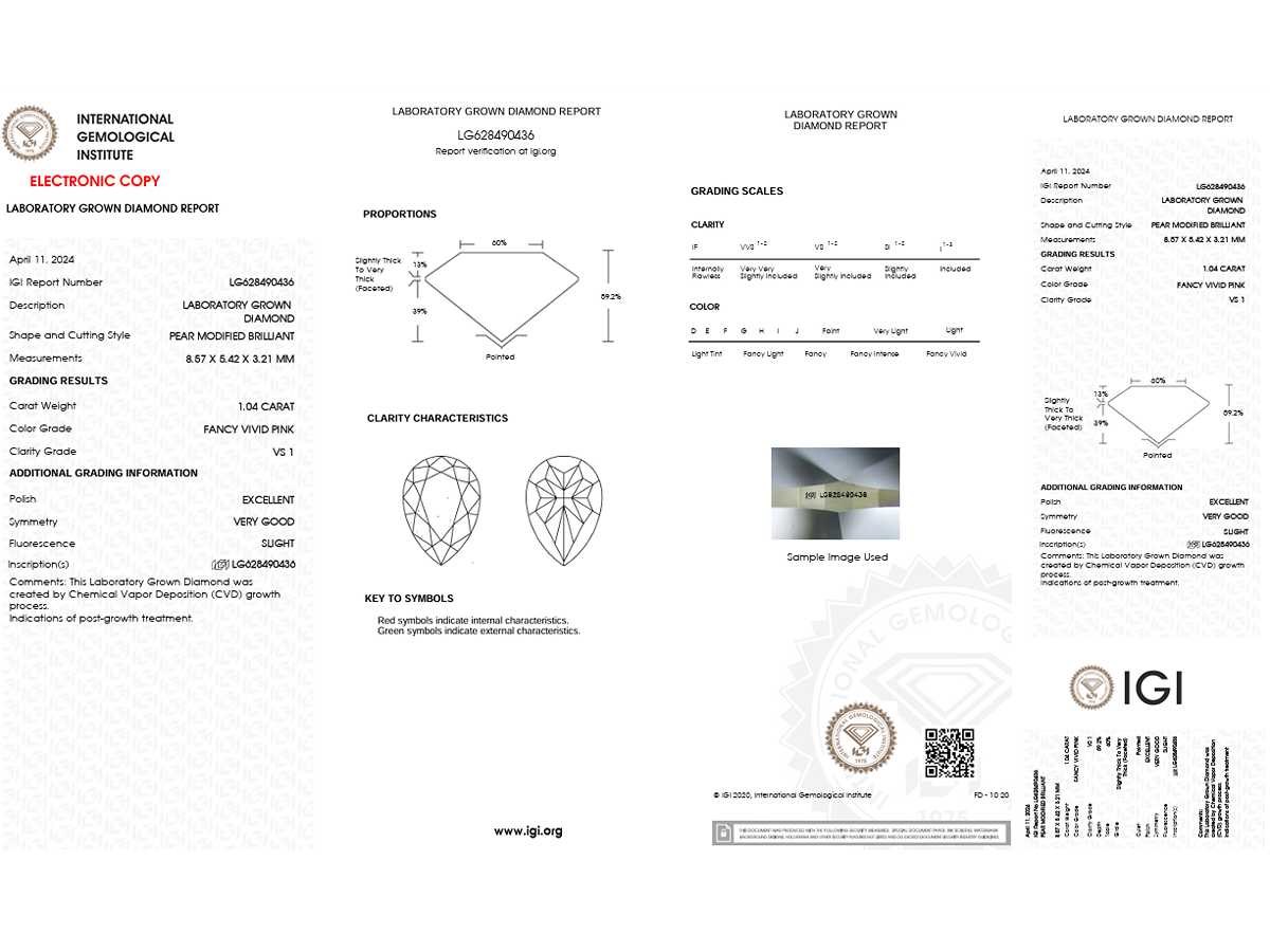 Alle diamanten hebben een gegraveerde laser-inscriptie. De kwaliteit is overgenomen uit het bijhorende certificaat. Bezorgtermijn 3 dagen Datering: 11-04-2024 Karaat: 1.04 Certificaat: LG628490436 Voornaamste diamant: Labgrown Diamant (CVD) Kleur diamant: Fancy Vivid Pink Slijpvorm diamant: Pear Modified Brilliant Zuiverheidsgraad diamant: VS1 Leveringsvoorwaarden: Per koerier
