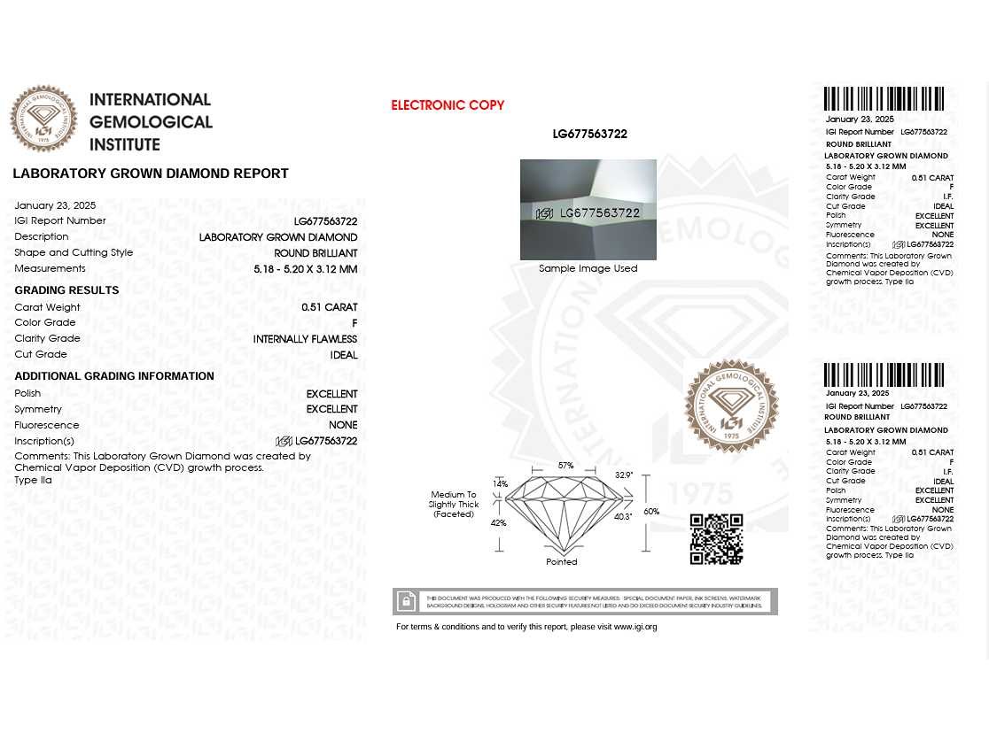 Alle diamanten hebben een gegraveerde laser-inscriptie. De kwaliteit is overgenomen uit het bijhorende certificaat. Bezorgtermijn 3 dagen Datering: 23-01-2025 Karaat: 0.51 Certificaat: LG677563722- IGI Voornaamste diamant: Labgrown diamant (CVD) Kleur diamant: F Slijpvorm diamant: Round Brilliant Slijpkwaliteit diamant: Excellent Zuiverheidsgraad diamant: IF Leveringsvoorwaarden: Per koerier