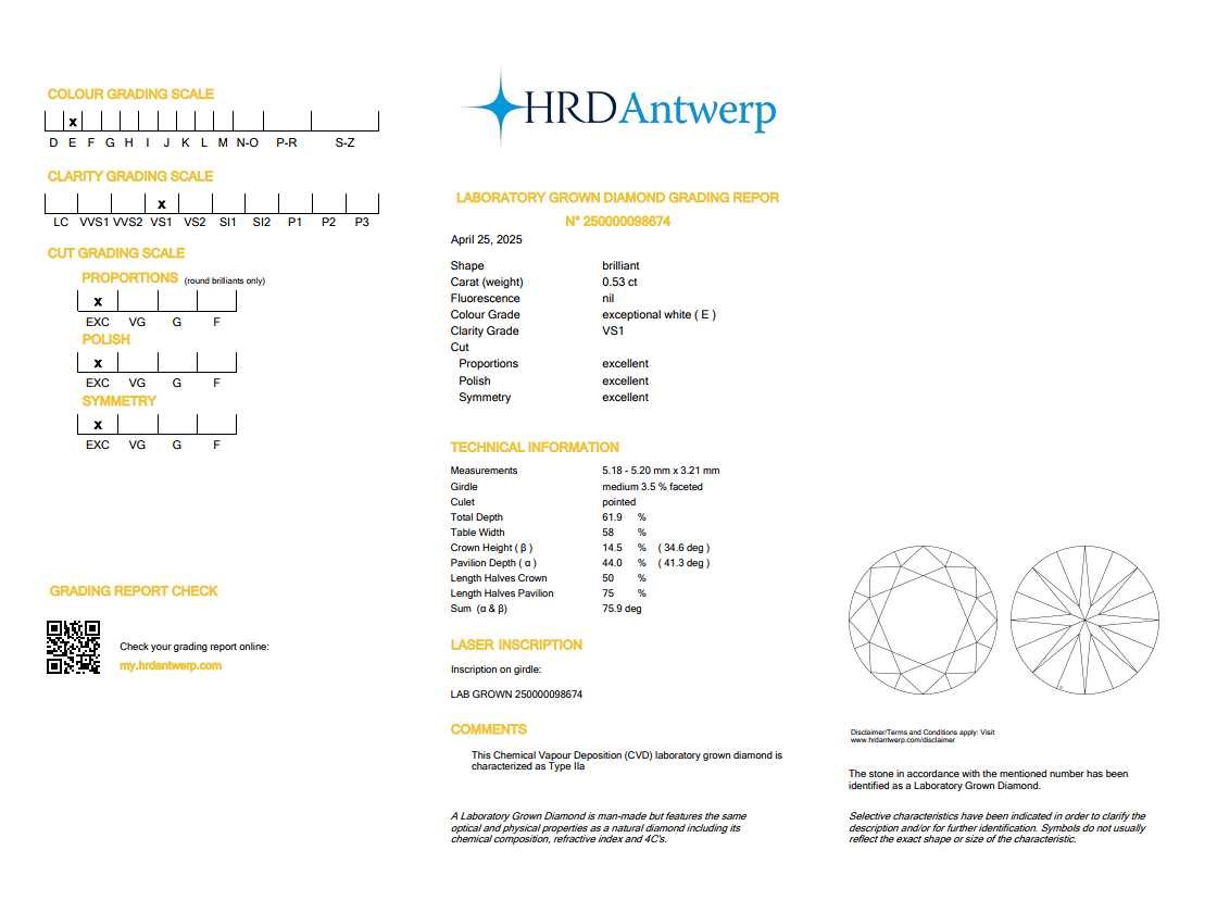 Alle diamanten hebben een gegraveerde laser-inscriptie. De kwaliteit is overgenomen uit het bijhorende certificaat. Bezorgtermijn 3 dagen Datering: 25-04-2025 Karaat: 0.53 Certificaat: 250000098674 Voornaamste diamant: Labgrown Diamant (CVD) Kleur diamant: E Slijpvorm diamant: round Brilliant Slijpkwaliteit diamant: Excellent Zuiverheidsgraad diamant: VS1 Leveringsvoorwaarden: Per koerier