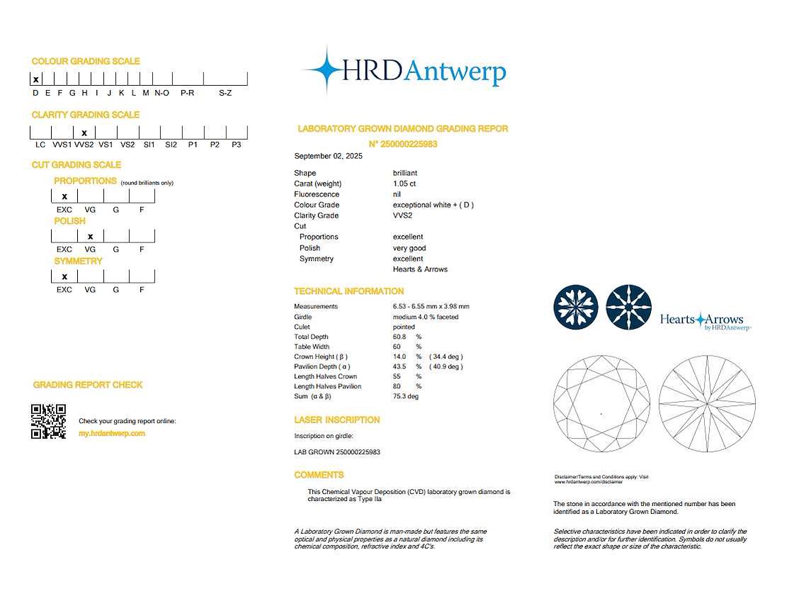 Alle diamanten hebben een gegraveerde laser-inscriptie. De kwaliteit is overgenomen uit het bijhorende certificaat. Bezorgtermijn 3 dagen Datering: 02-09-2025 Karaat: 1.05 Certificaat: 250000225983 Voornaamste diamant: Labgrown Diamant (CVD) Kleur diamant: D Slijpvorm diamant: round - Hearts & Arrows Brilliant Slijpkwaliteit diamant: Excellent Zuiverheidsgraad diamant: VVS2 Leveringsvoorwaarden: Per koerier