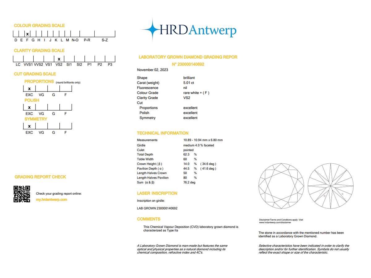 Alle diamanten hebben een gegraveerde laser-inscriptie. De kwaliteit is overgenomen uit het bijhorende certificaat. Bezorgtermijn 3 dagen Datering: 02-11-2023 Karaat: 5.01 Certificaat: 230000140692 Voornaamste diamant: Labgrown diamant (CVD) Kleur diamant: F Slijpvorm diamant: round Brilliant Zuiverheidsgraad diamant: VS2 Leveringsvoorwaarden: Per koerier