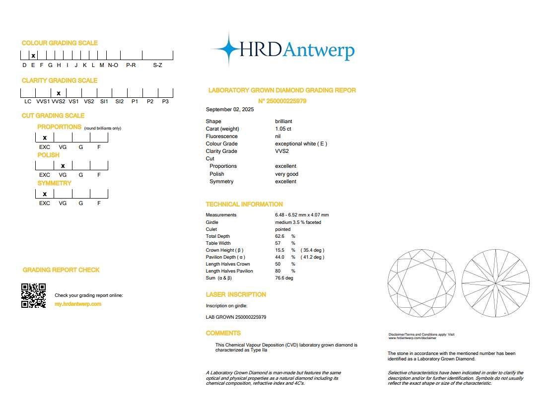 Alle diamanten hebben een gegraveerde laser-inscriptie. De kwaliteit is overgenomen uit het bijhorende certificaat. Bezorgtermijn 3 dagen Datering: 02-09-2025 Karaat: 1.05 Certificaat: 250000225979 Voornaamste diamant: Labgrown Diamant (CVD) Kleur diamant: E Slijpvorm diamant: round Brilliant Slijpkwaliteit diamant: Excellent Zuiverheidsgraad diamant: VVS2 Leveringsvoorwaarden: Per koerier