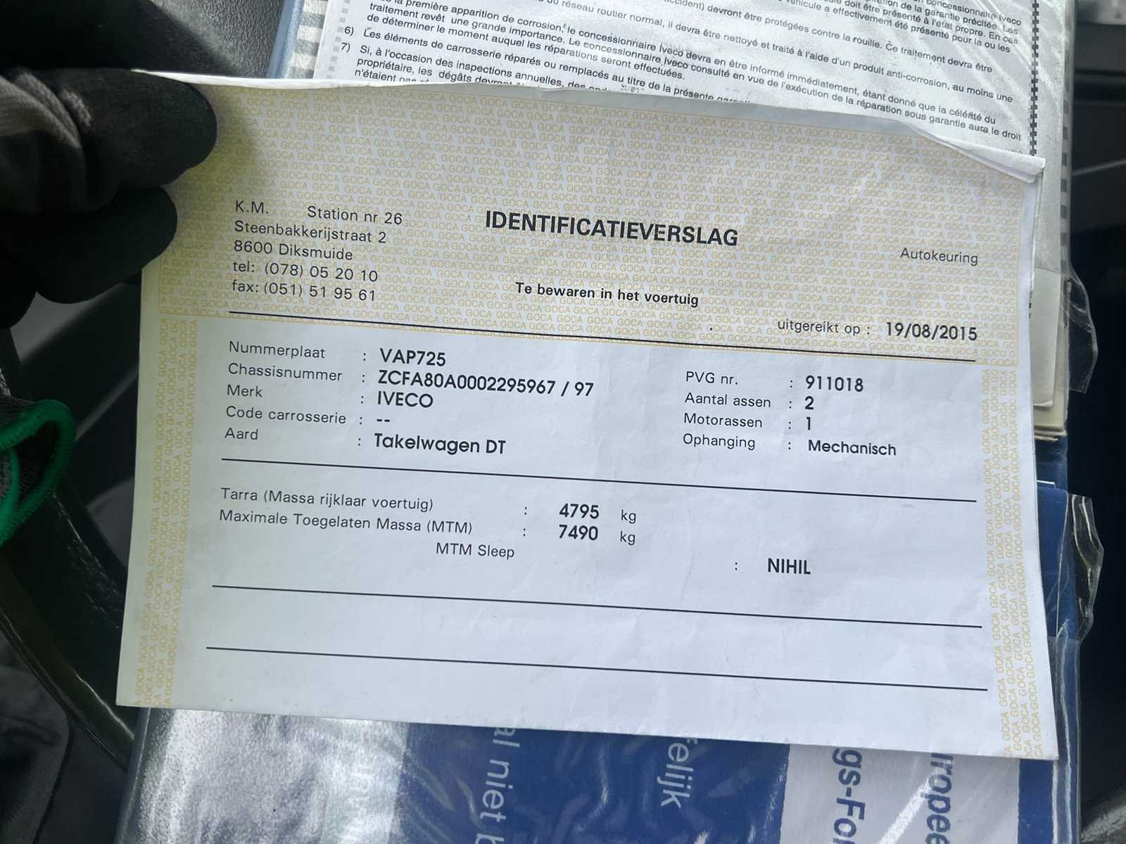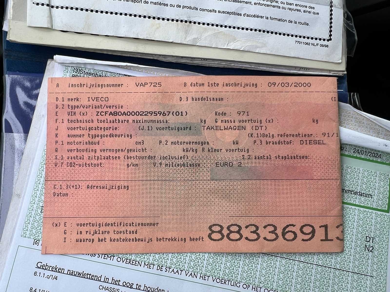 1 STE EIGENAAR GOEDE STAAT ALLES WERKT PERFECT TOT OP HEDEN ALTIJD GEBRUIKT ALLE PAPIEREN EN SLEUTELS AANWEZIG Merk: IVECO Type: 80E15/75TAKELWAGEN Bouwjaar: 2000 Chassisnummer VIN: ZCFA80A0002295967 Kilometerstand bij opname: 18732447km Datum eerste toelating: 09-03-2000 Type transmissie: Handmatig Emissieklasse: 2 Hydraulische laadklep: true Eigen gewicht: 4795kg Nationaliteit documenten: BELGIE Kentekenpapieren compleet?: true Diesel: true