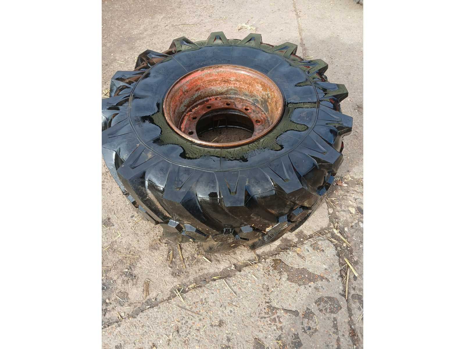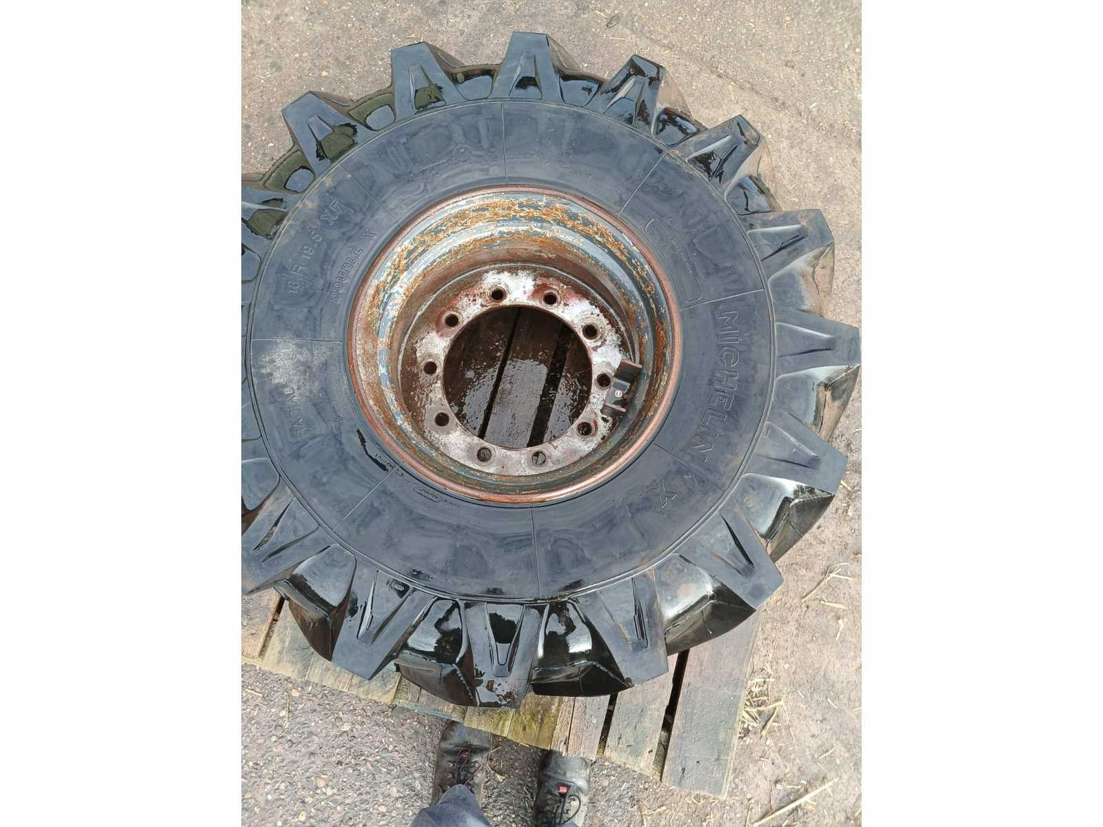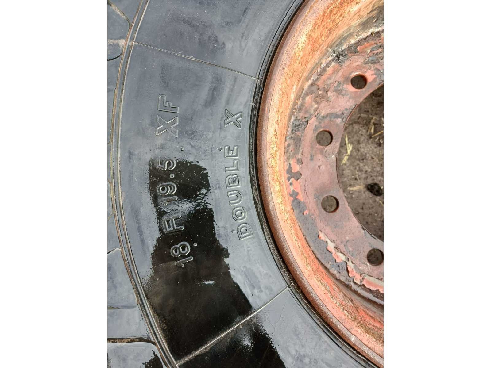 Robuuste Michelin 18R19.5 XF Double X band, gemonteerd op stalen velg met 8-bouts bevestiging. Deze band is geschikt voor zwaar transport, aanhangwagens, landbouw- of industriële toepassingen. Kenmerken: Bandenmaat: 18 R 19.5 - Type: Michelin XF Double X - Stevige radiale constructie (tubeless) - Diep profiel, geschikt voor terrein- en weggebruik - Velg: staal, 8-bouts (steekcirkel ca. 22 cm) - Band in goede staat, velg met lichte roestvorming - Staat: Band in goede, nauwelijks gebruikte staat; velg gebruikt maar functioneel. Merk: Michelin Type: Double X XF Bandenmaat: 18 R 19.5