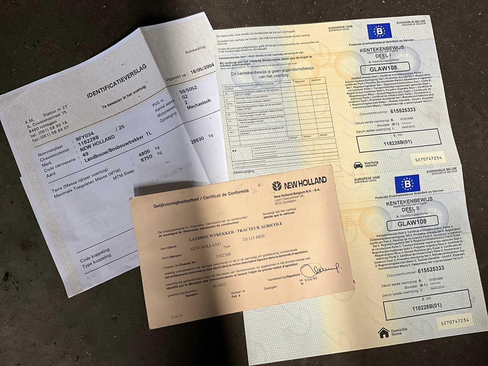 Boorddocumenten: gelijkvormigheidsattest, inschrijvingsbewijs, identificatieverslag Merk: New Holland Type: TS115 Bouwjaar: 1999 Afgelezen urenstand: 7147 Aantal hydraulische ventielen achter: 4 Bandenmaat voor: 480/65R28 Bandenmaat achter: 600/65R38 Frontgewichtenset: true Cabine: true Luchtgeveerde stoel: true Eigen gewicht: 4805kg Totale afmeting L: 4900mm Totale afmeting Breedte: 2200mm Totale afmeting Hoogte: 2900mm Chassisnummer: 118228B Datum eerste toelating: 07/02/2000 Nationaliteit documenten: Belgisch