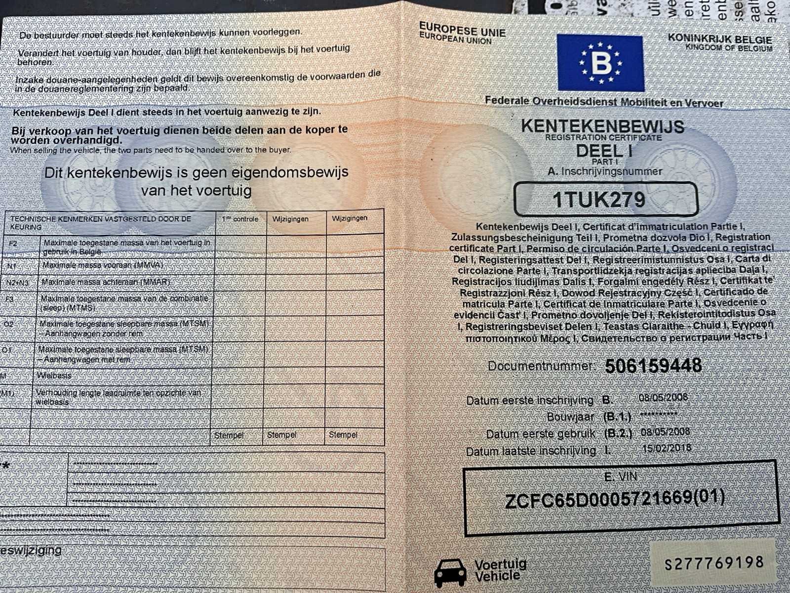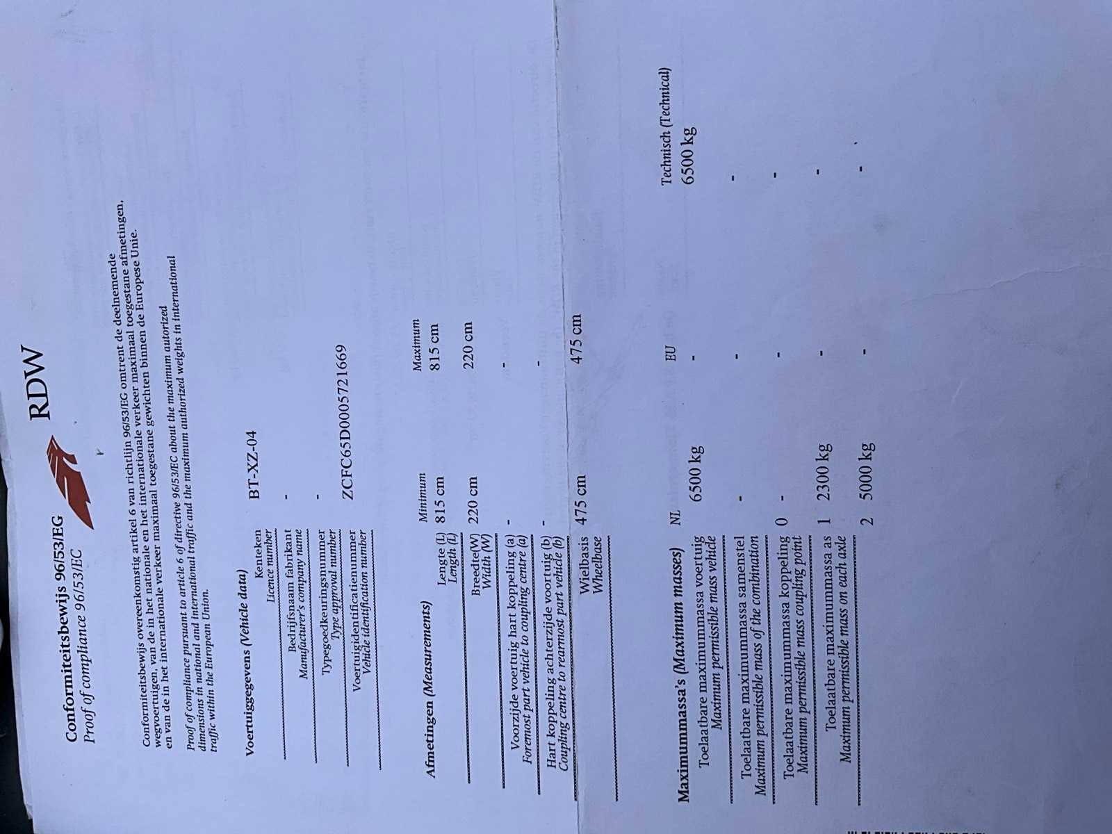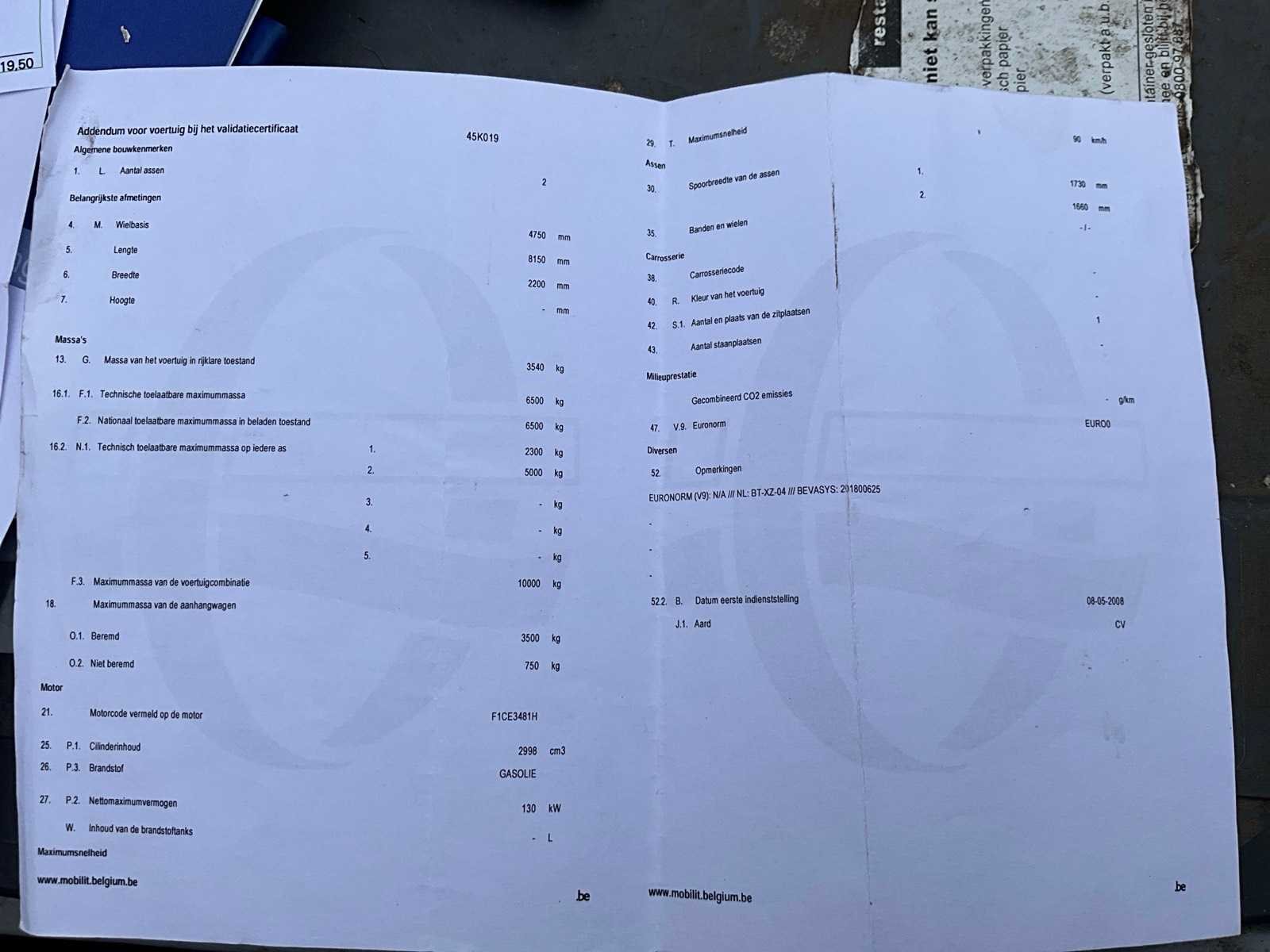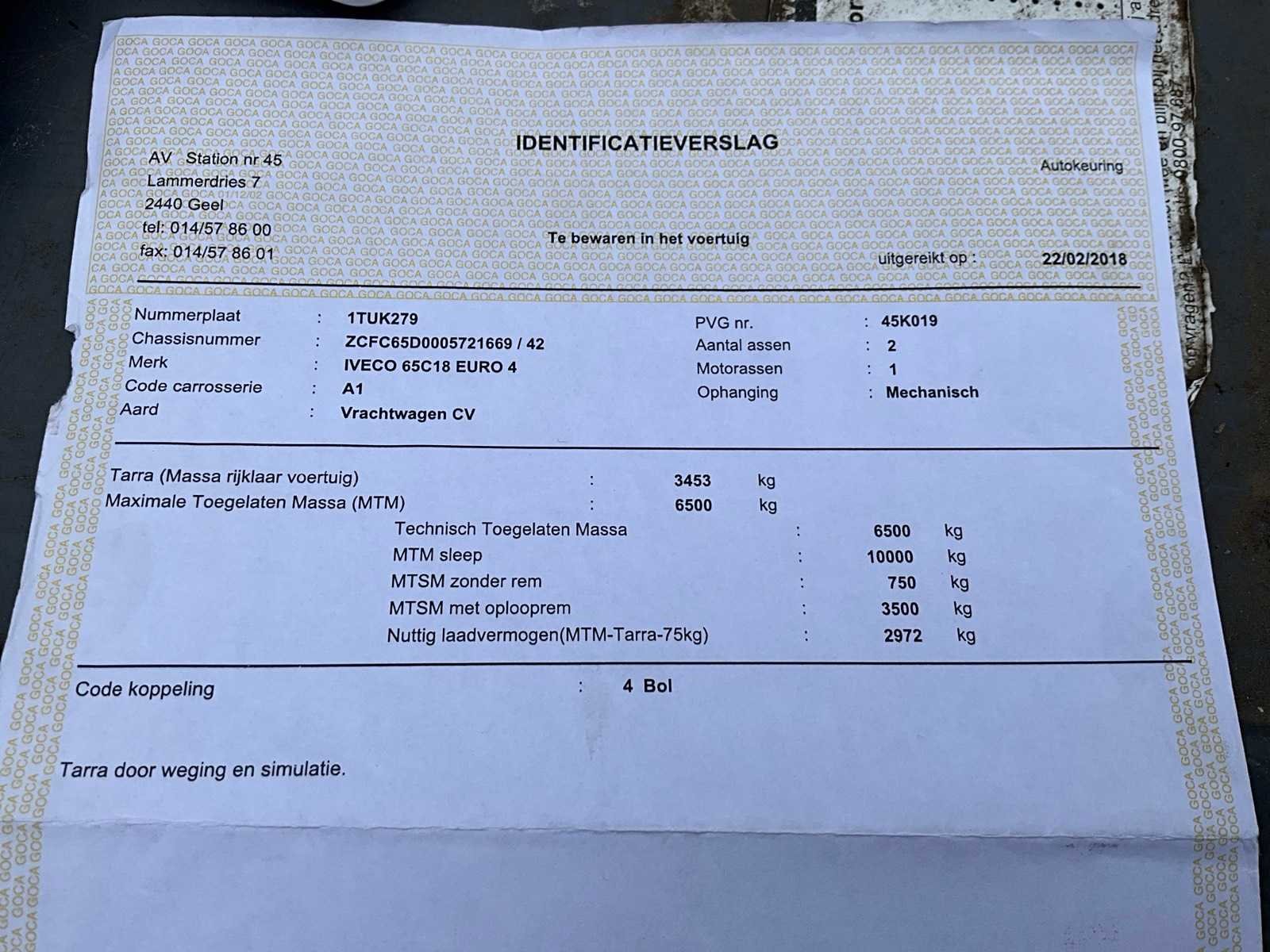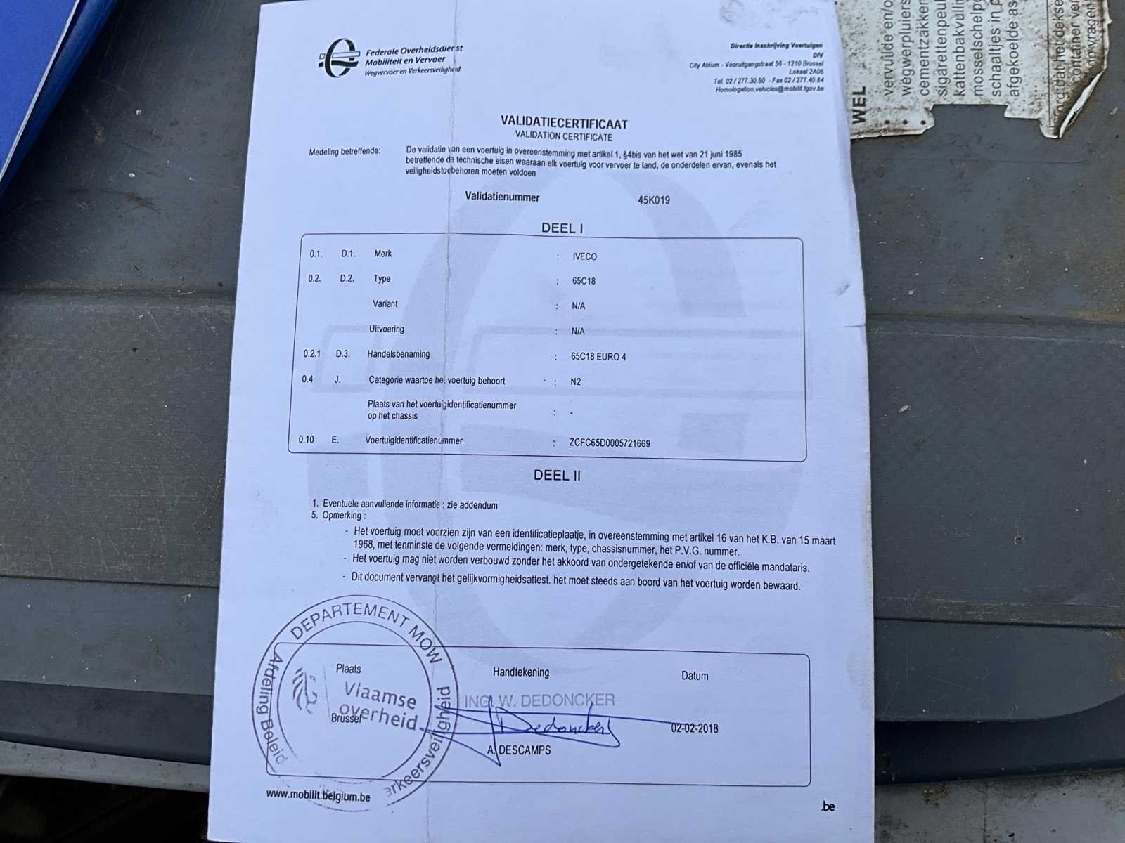 Wagen werd rijdend weggezet na de laatste technische keuring op 285233km (geen belangrijke opmerkingen vermeld) - Batterij ontbreekt , dient vervangen te worden - Technisch in orde en rijklaar zodra een nieuwe batterij geplaatst is. Uiterlijk: vervuild door buitenstalling, maar chassis en carrosserie lijken gezond (zie foto’s) - Na een grondige poetsbeurt zal de vrachtwagen er aanzienlijk beter uitzien (zie laatste foto’s) - Kentekenpapieren compleet - met trekhaak 3500kg - binnen in cabine kan je recht staan Merk: Iveco Type: 65C18 Bouwjaar: 2008 Chassisnummer VIN: ZCFC65D0005721669 Cilinderinhoud: 2998cc Kilometerstand bij opname: 285259km Datum eerste toelating: 8/5/2008 Type transmissie: halfautomaat Aantal assen: 2 Fuel Type: Diesel Laadvermogen: 2972kg Aantal sleutels: 1 Emissieklasse: Euro 4 Gesloten opbouw: true Eigen gewicht: 3453kg Totale afmeting L: 8150mm Totale afmeting Breedte: 2200mm Totale afmeting Hoogte: 2900mm Nationaliteit documenten: B Aantal zitplaatsen: 1 Diesel: true