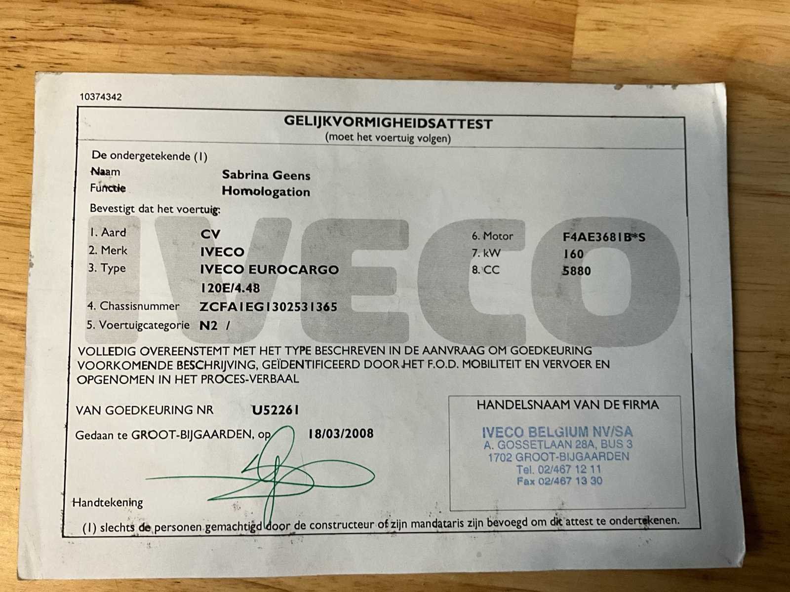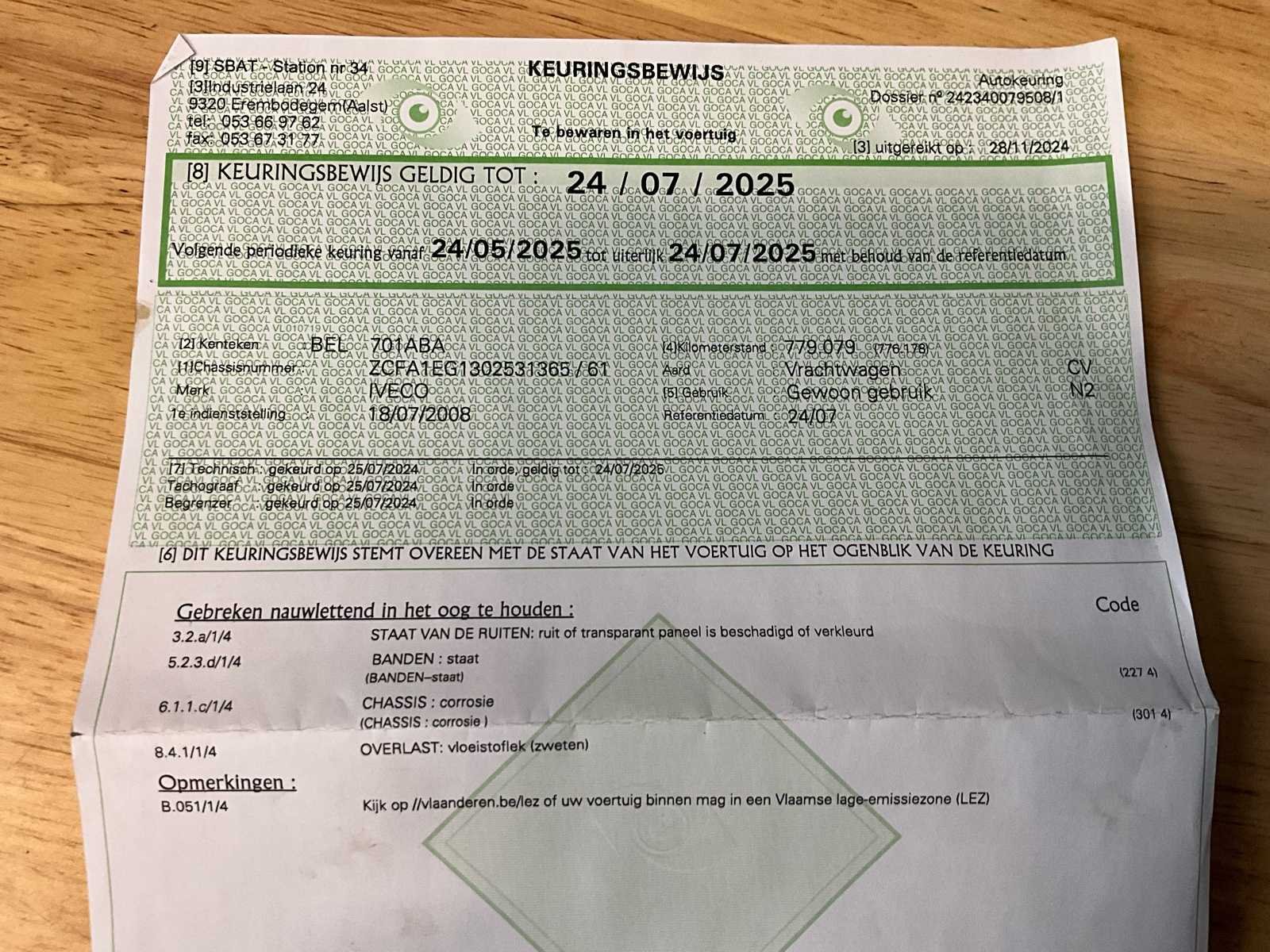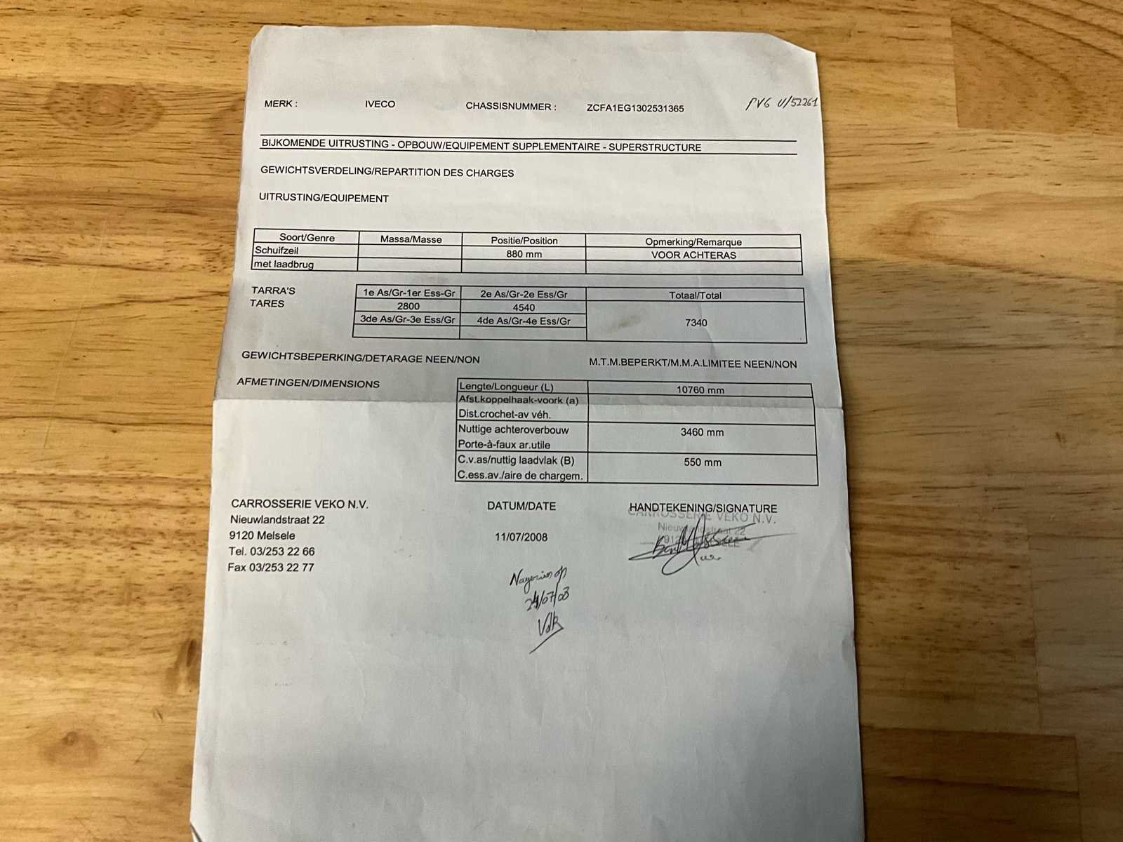 Uitrusting Luchtvering op achteras Luchtremmen Veko schuifzeil (blauw), staal/aluminium frame Hydraulische laadklep Dhollandia Achterdeuren Zonnekap met “Euro 5”-aanduiding Buitenspiegels met dodehoekwaarschuwing Dagcabine met 2 stoelen Radio, stuurbediening Dashboard digitaal met kilometerteller Staat van het voertuig Algemeen: Gebruikte staat, met zichtbare gebruiks- en roestsporen (zie foto’s) Carrosserie: Roestvorming aan achterzijde, lichte schade aan kunststofdelen Cabine: Compleet, bestuurdersstoel gescheurd Interieur: Gebruikssporen zichtbaar Laadklep: Aanwezig, werking niet getest Keuring: Geldig tot 24/07/2025 Opmerkingen keuring: Opmerkingen betreffende banden, chassis-corrosie en vloeistoflekkage (“zweten”) VOERTUIG START, RIJDT EN LAADKLEP WERKT Merk: Iveco Type: Eurocargo 120E22 Bouwjaar: 2008 Chassisnummer VIN: ZCFA1EG1302531365 Cilinderinhoud: 5880cc Kilometerstand bij opname: 787123km Datum eerste toelating: 18/7/2008 Type transmissie: Handmatig Asconfiguratie: 4x2 Fuel Type: Diesel Laadvermogen: 4400kg Emissieklasse: Euro 5 Eigen gewicht: 7570kg Totale afmeting L: 10760mm Totale afmeting Breedte: 2450mm Totale afmeting Hoogte: 3200mm Nationaliteit documenten: B Kentekenpapieren compleet?: true Handgeschakelde versnellingsbak: true Diesel: true