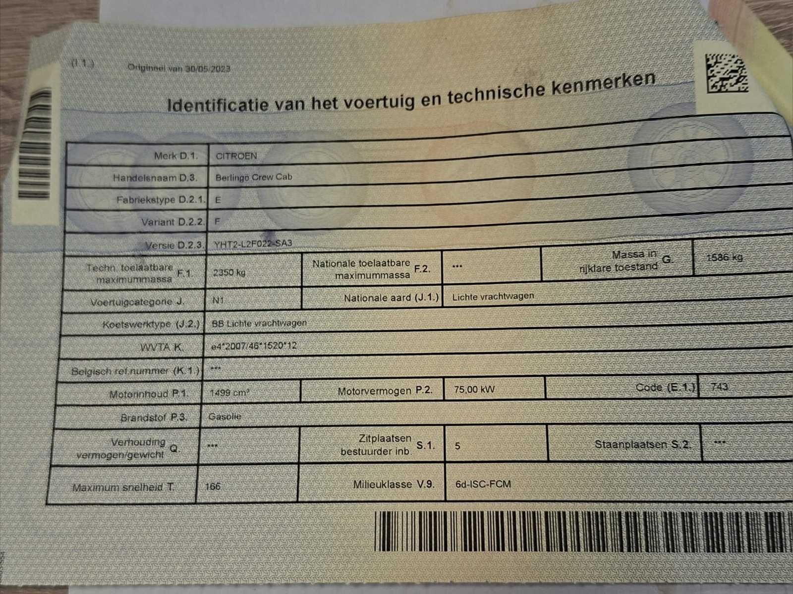 Deze praktische en moderne Berlingo is uitgerust met twee schuifdeuren, ruime dubbele cabine en een grote laadruimte achteraan. De wagen beschikt over een modern dashboard met touchscreen, airco en elektrische ramen. Ideaal voor zelfstandigen, bouwbedrijven, installateurs of ploegvervoer. De motorruimte en het interieur zijn volledig, maar de wagen is niet getest op starten of rijden. De buitenzijde toont normale gebruikssporen en lichte krassen, zoals zichtbaar op de foto’s. Interieur is gebruikt maar volledig zonder scheuren. Lengte: ca. 4,70 m Breedte: ca. 1,85 m (zonder spiegels) Hoogte: ca. 1,80 m Laadruimte: ± 2,16 m lengte achter stoelen Laadvolume: ± 3,9 m³ Opties: Touchscreen infotainment Elektrische ramen Cruise control / bediening aan stuur Airco Parkeersensoren achter Carrosserie vertoont normale gebruikssporen, lichte krassen; Interieur: gebruikssporen maar volledig; Motorruimte oogt volledig en netjes Merk: Peugeot Model: Berlingo XL Type: - dubbele cabine Bouwjaar: 2023 Afgelezen kilometerstand: 96359km Cilinderinhoud: 1499cc Vermogen (kW): 75kW Brandstof: diesel Chassisnummer: VR7EFYHT2PJ574735 Datum eerste toelating: 30/5/2023 Kleur: grijs Transmissie: manueel Emissieklasse: Euro 6d Aantal deuren: 6 Ledig gewicht: 1586kg Nationaliteit documenten: B Gelijkvormigheidsattest aanwezig: true Start en rijdt: ja Zichtbare schade: ja Vavato voert geen technische keuring uit.: true Airconditioning: true Navigatie: true Inschrijvingsbewijs - deel 1 : aanwezig Inschrijvingsbewijs - deel 2: aanwezig
