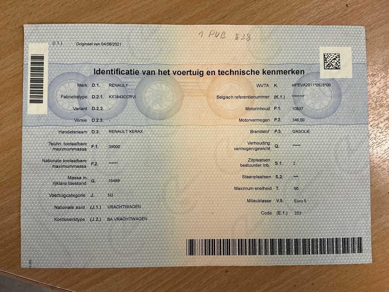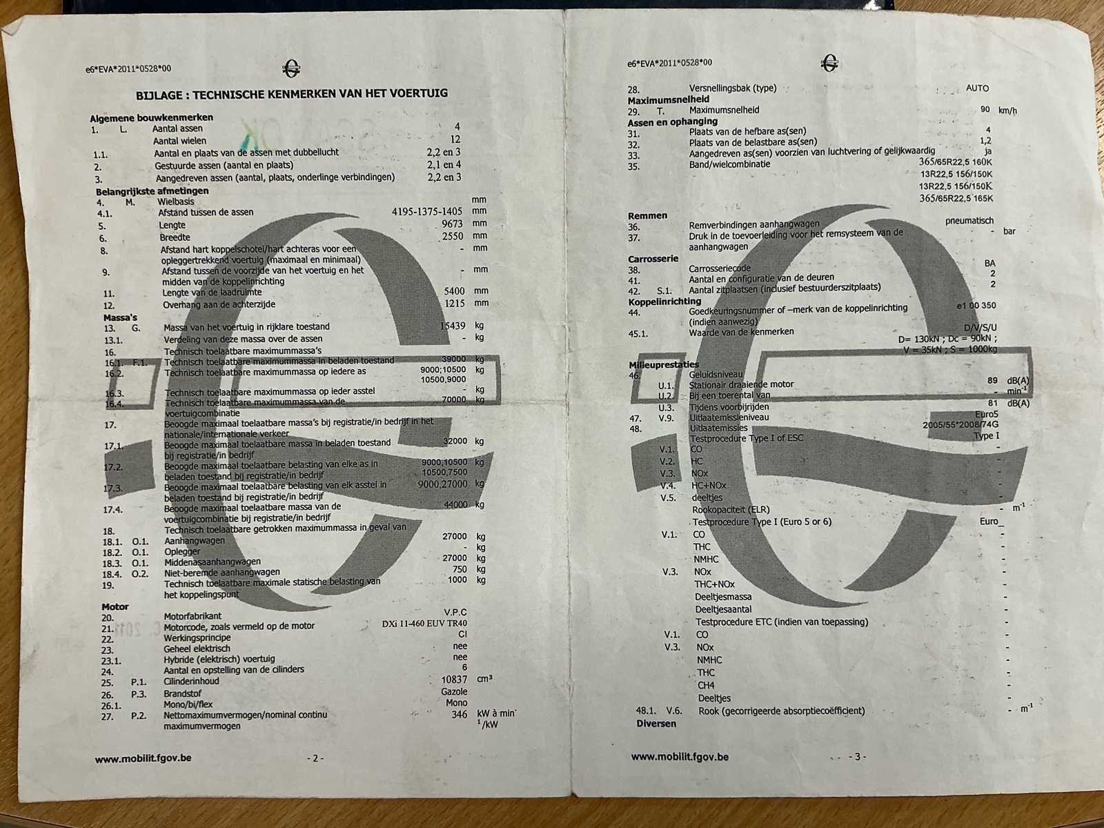 Merk: Renault Type: Kerax 460 Tridem Bouwjaar: 2011 Chassisnummer VIN: VF634DPA000009959 Cilinderinhoud: 10837cc Kilometerstand bij opname: 387901km Datum eerste toelating: 23/12/2011 Type transmissie: Automatisch Aantal assen: 4 Asconfiguratie: 8x4 Tridem Fuel Type: Diesel Laadvermogen: 15295kg Aantal sleutels: 1 Emissieklasse: Euro 5 Laadkraan: true Eigen gewicht: 15489kg Totale afmeting L: 9000mm Totale afmeting Breedte: 2550mm Totale afmeting Hoogte: 3400mm Startinformatie: Start, rijdt, remt maar heeft algemeen onderhoud nodig voor verder professioneel gebruik Afgelezen kilometerstand: 387901km Nationaliteit documenten: BE Kentekenpapieren compleet?: true Aantal zitplaatsen: 2
