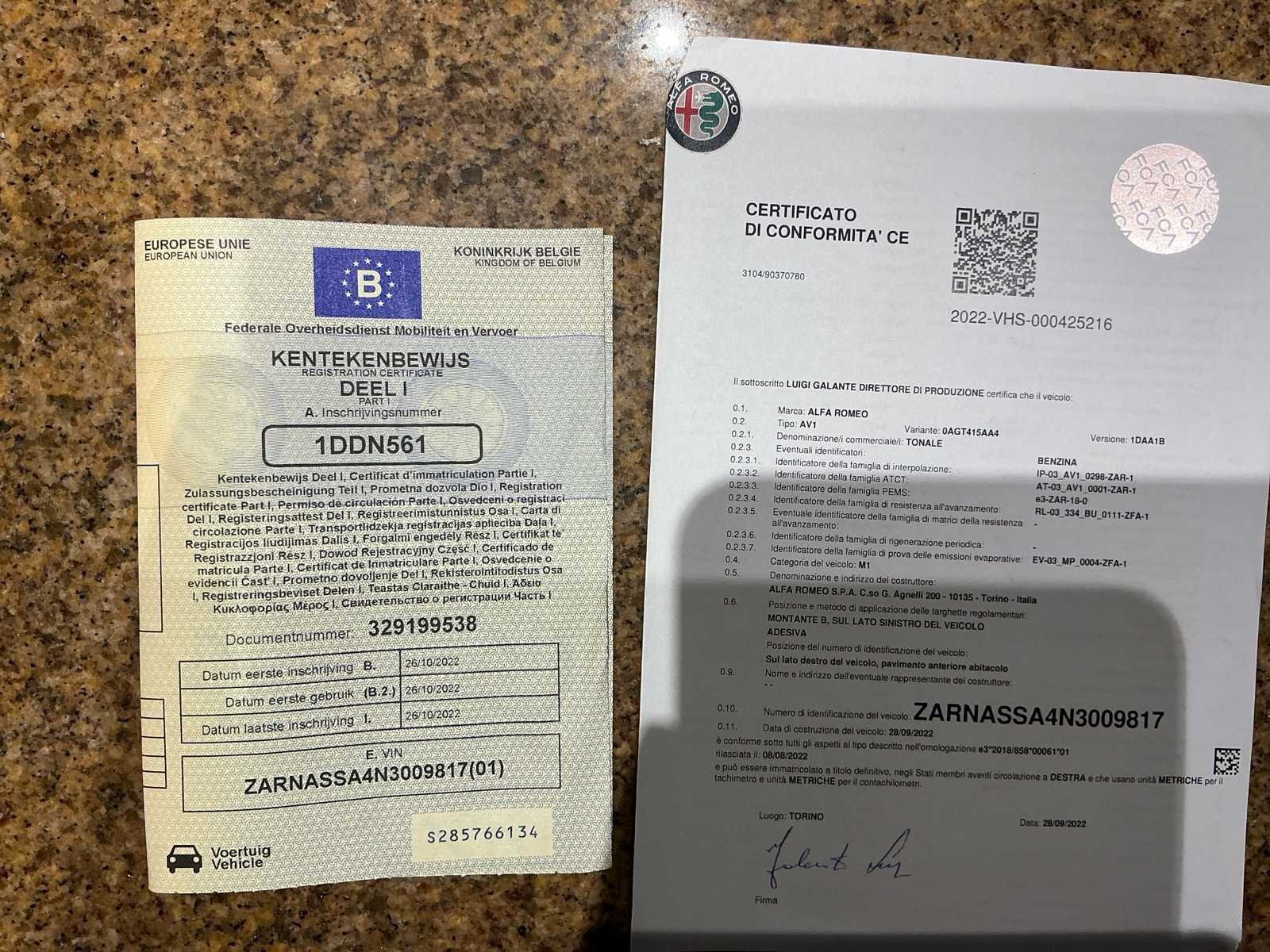 29/04/2025 - Groot onderhoud gehad / 4 nieuwe banden / nieuwe batterij Merk: Alfa Romeo Model: Tonale Type: AV1 Bouwjaar: 2022 Afgelezen kilometerstand: 540014km Cilinderinhoud: 1469cc Vermogen (kW): 96kW Brandstof: Benzine Chassisnummer: ZARNASSA4N3009817 Datum eerste toelating: 29/10/2022 Aantal zitplaatsen: 5 Kleur: Blauw Transmissie: Automaat Aantal deuren: 5 Aantal sleutels: 2 Nationaliteit documenten: Belgisch Gelijkvormigheidsattest aanwezig: true Carpass: true Start en rijdt: Ja Vavato voert geen technische keuring uit.: true Airconditioning: true Navigatie: true Xenon verlichting: true Inschrijvingsbewijs - deel 1 : Ja Inschrijvingsbewijs - deel 2: Ja