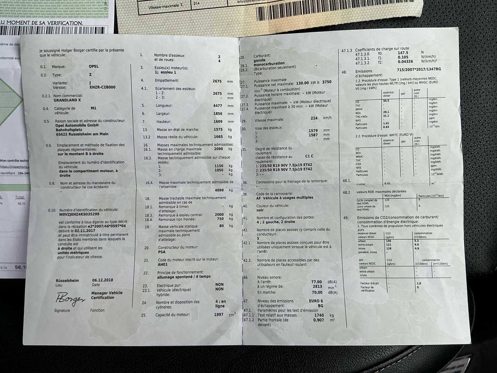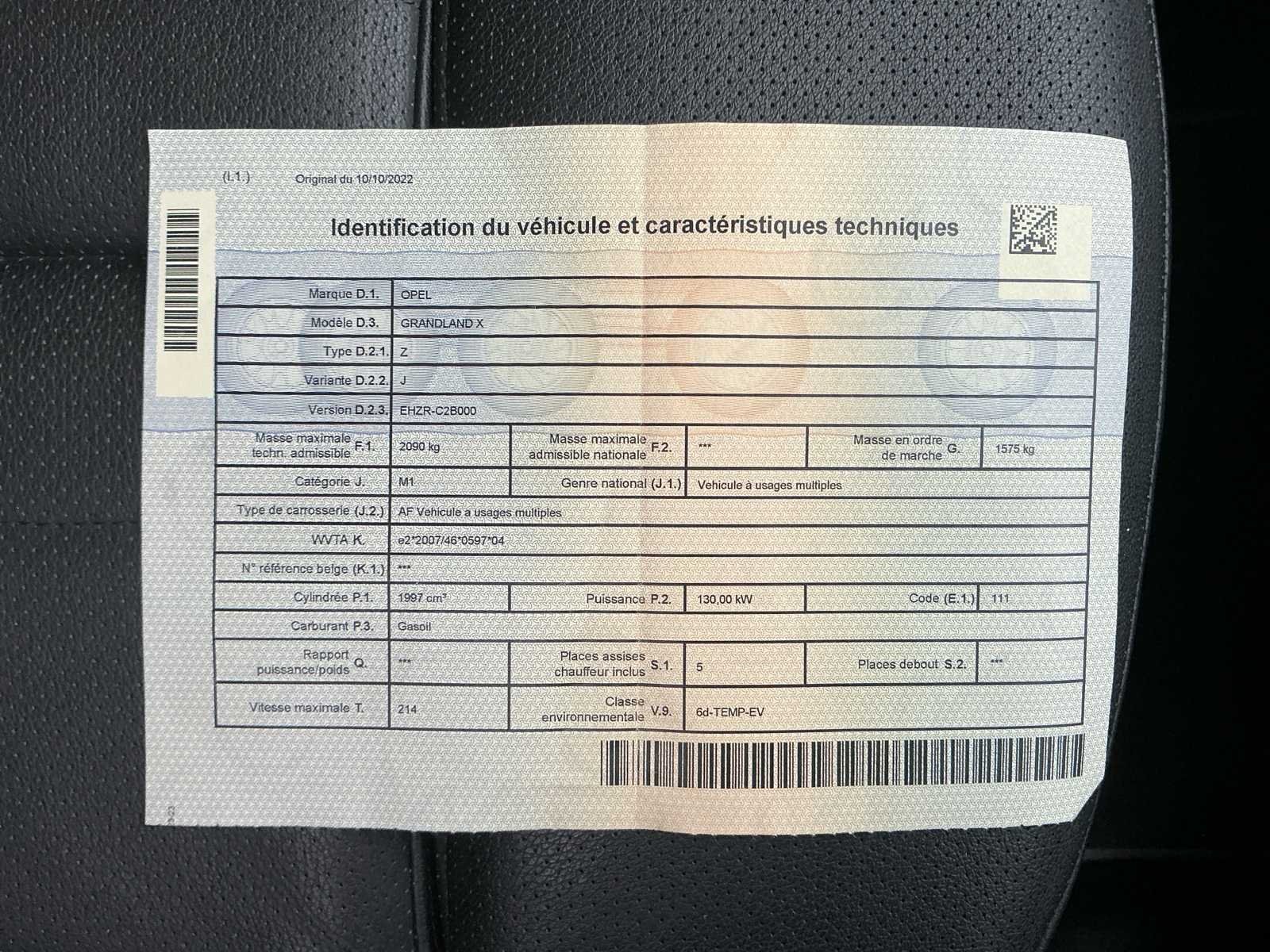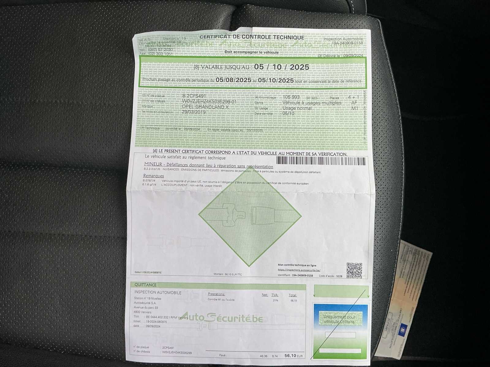 De wagen beschikt over volgende opties: -Parkeersensoren voor en achteraan -Navigatie -Carplay -Achteruitrijcamera. -Elektrische stoelen. -Lederen zetels. -Trekhaak Merk: Opel Model: Grandland X 2.0 HDI 177Pk Type: Suv Bouwjaar: 2019 Afgelezen kilometerstand: 115521km Cilinderinhoud: 1997cc Vermogen (kW): 130kW Brandstof: Diesel Chassisnummer: W0VZJEHZ4KS035299 Datum eerste toelating: 29/03/2019 Aantal zitplaatsen: 5 Kleur: Zwart Transmissie: Automaat Emissieklasse: Euro 6d Aantal deuren: 5 Nationaliteit documenten: Belgisch Gelijkvormigheidsattest aanwezig: true Vavato voert geen technische keuring uit.: true Airconditioning: true Navigatie: true Inschrijvingsbewijs - deel 1 : Aanwezig Inschrijvingsbewijs - deel 2: Aanwezig