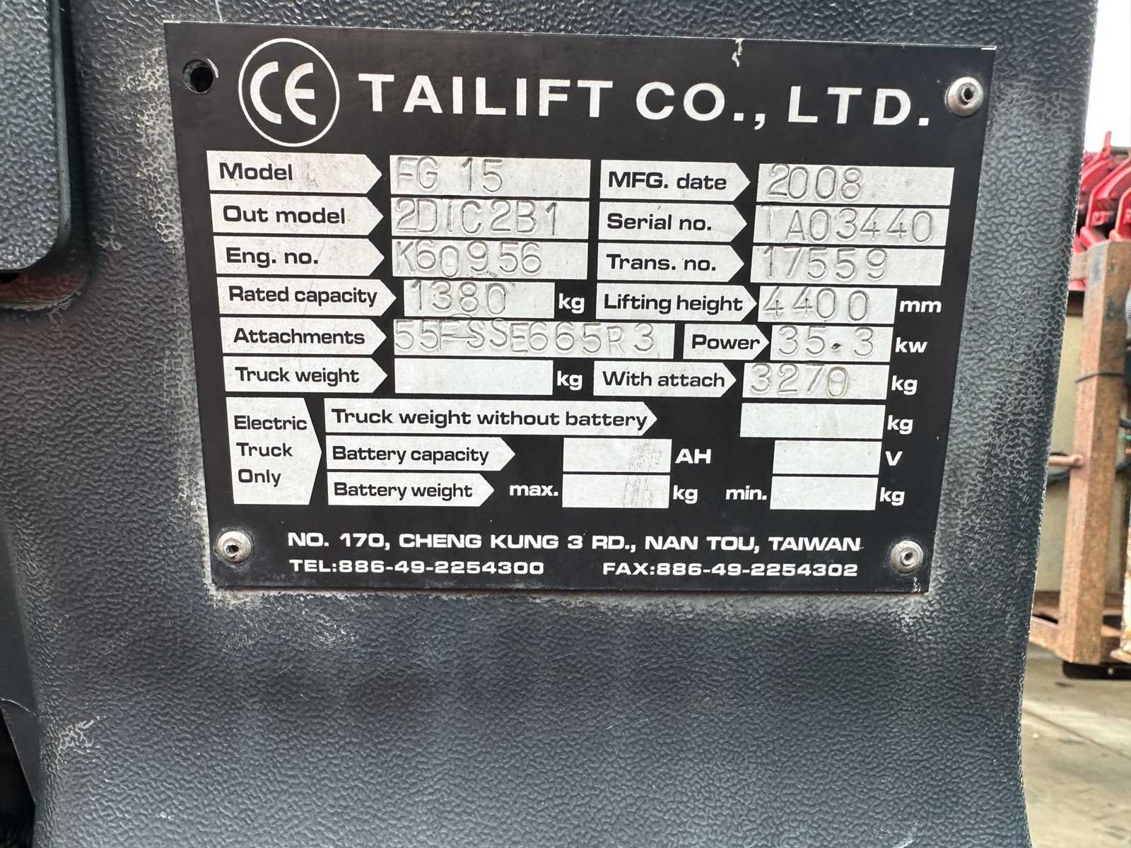 Geen documenten Side shift Merk: Tailift Type: FG15 Bouwjaar: 2008 Serienummer: TA03440 Brandstof: Gas Aantal wielen: 4 Afgelezen urenstand: 4027 Side-shift: true Triple mast: true Eigen gewicht: 3270kg Hefvermogen: 1380kg Lepellengte: 1100mm Max. hefhoogte: 4400mm Vol rubber banden: true Totale afmeting L: 2300mm Totale afmeting Breedte: 1200mm Totale afmeting Hoogte: 2100mm LPG: true