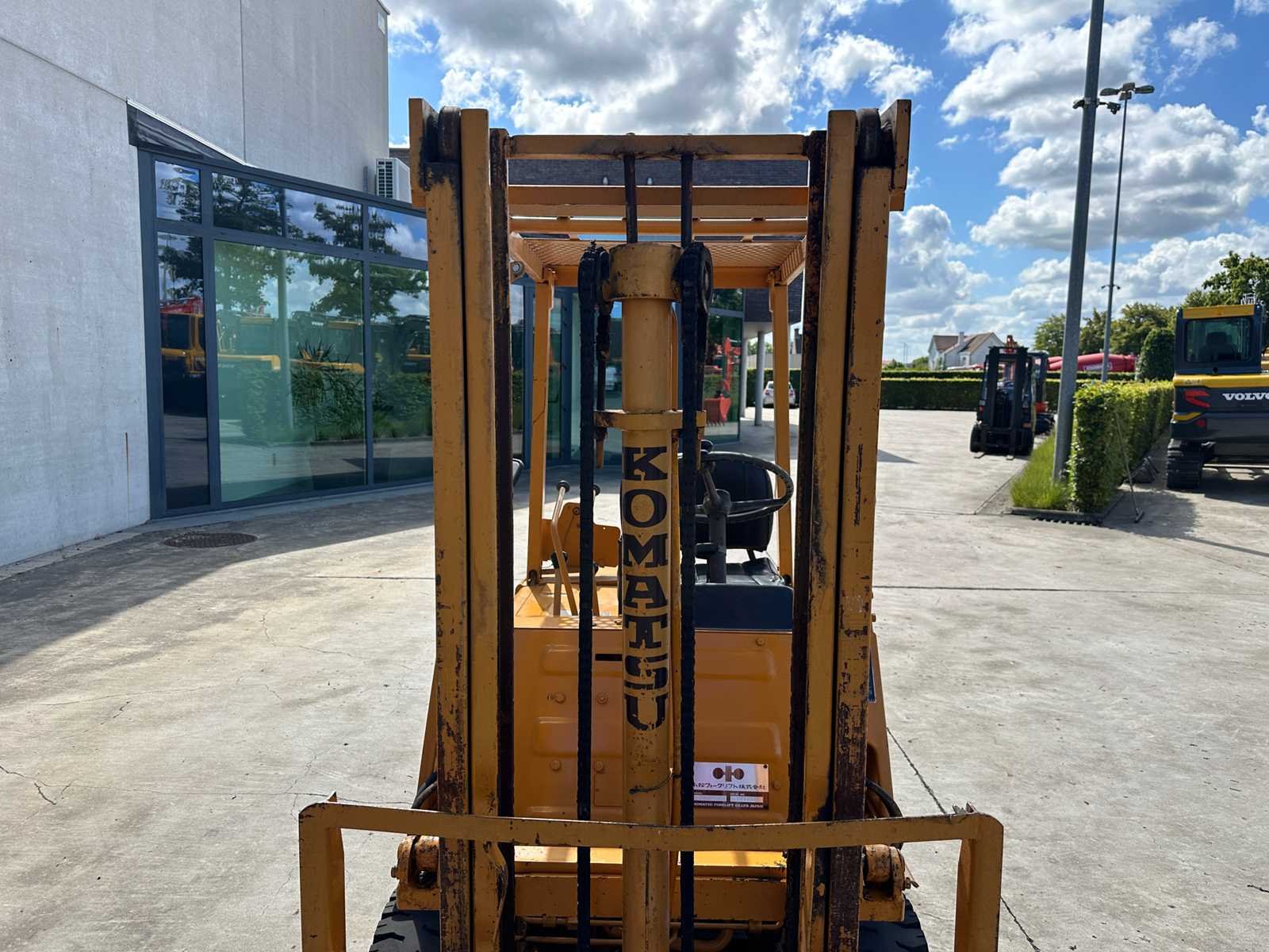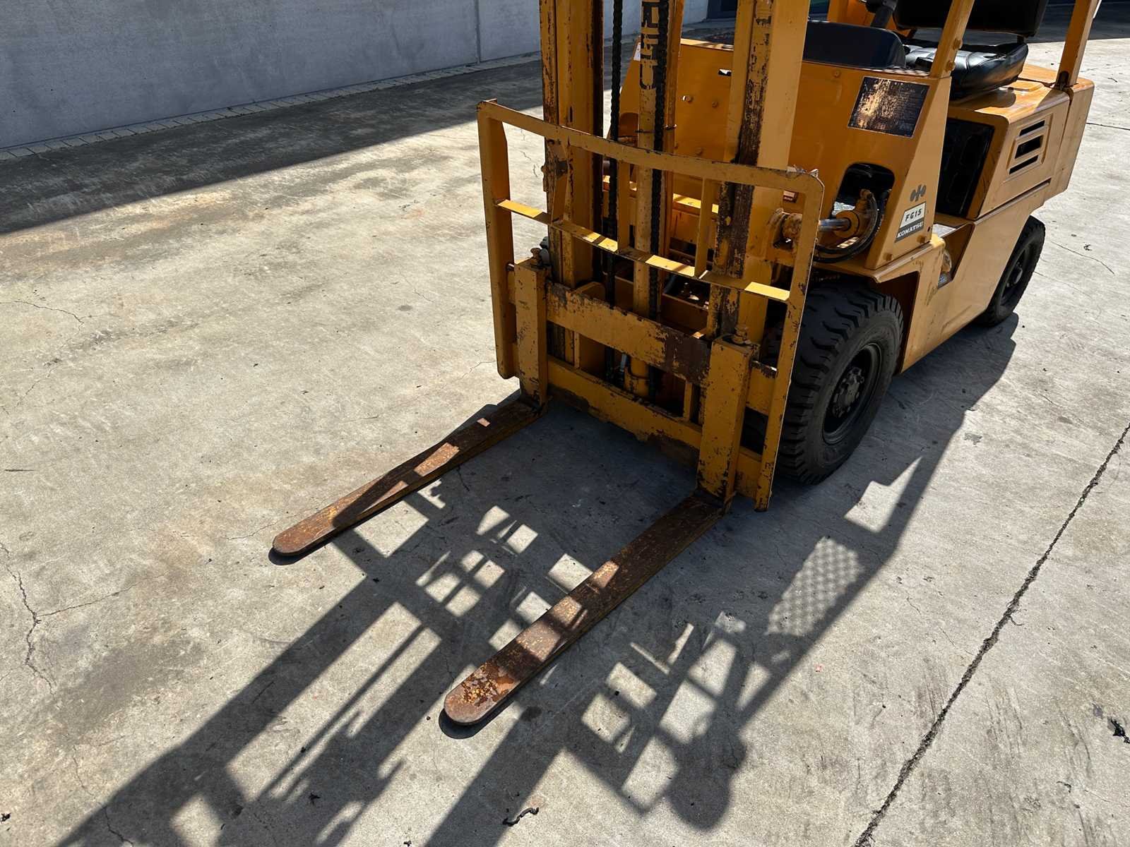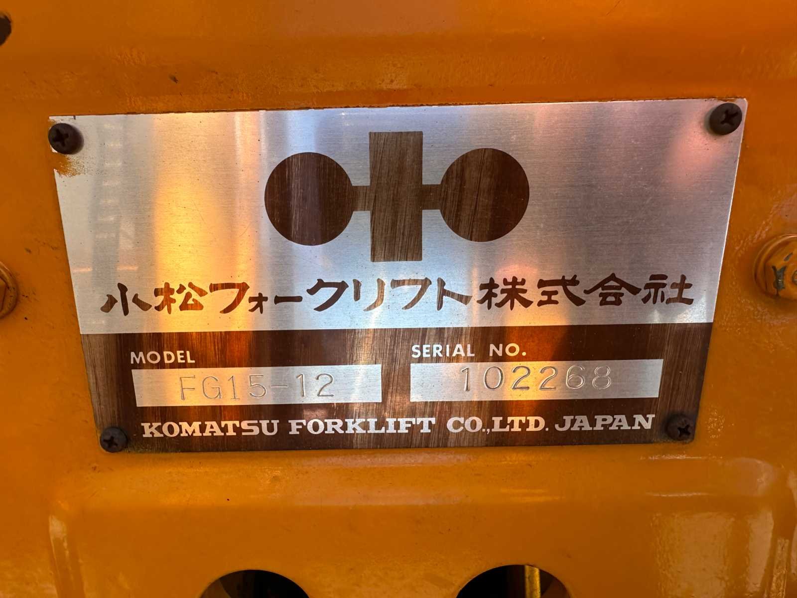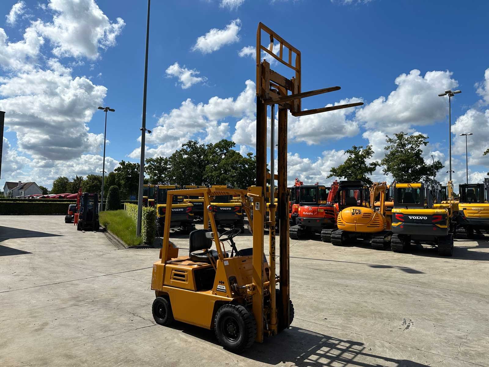 Manuele versnellingsbak Geen urenteller Geen documenten Merk: Komatsu Type: FG15-12 Bouwjaar: 1984 Serienummer: 102268 Brandstof: benzine Mast: 2-delig Soort band: lucht Aantal wielen: 4 Duplex mast: true Eigen gewicht: 2610kg Hefvermogen: 1500kg Lepellengte: 1000mm Max. hefhoogte: 3300mm Hefhoogte: 3000mm Totale afmeting L: 2200mm Totale afmeting Breedte: 1100mm Totale afmeting Hoogte: 2100mm