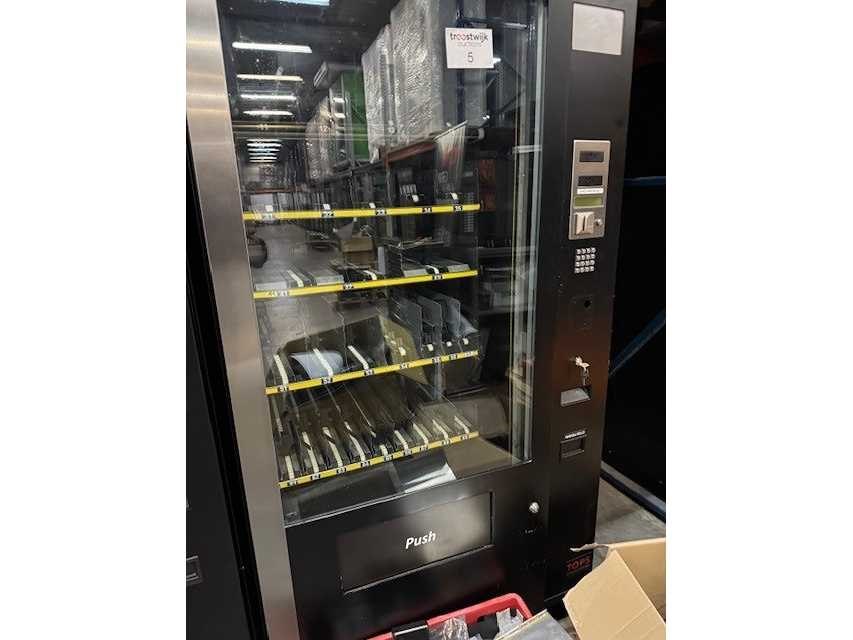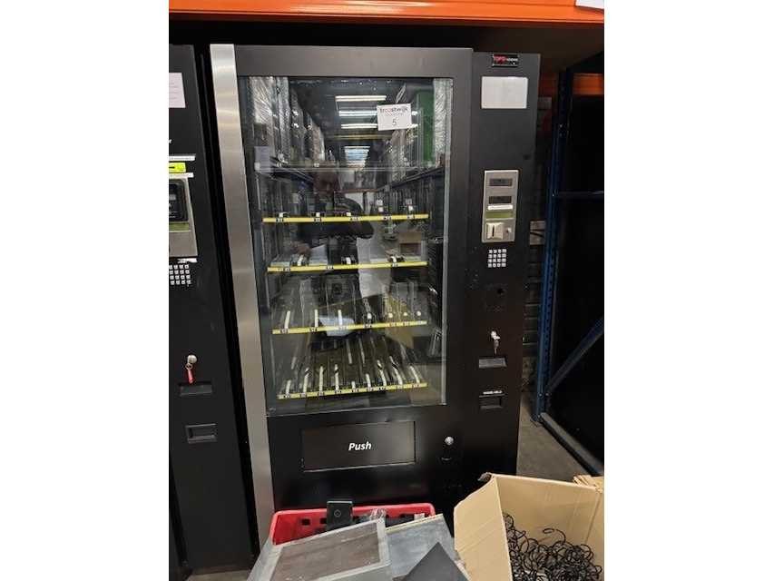 Automaat met lift voor verkoop van diverse goederen zoals brood, drank en voeding in staat waarin het zich bevindt Merk: Jofemar Model: Vision ES Plus Kleur: zwart Gewicht: 320kg Lengte: 105,10cm Breedte: 97cm Hoogte: 193cm