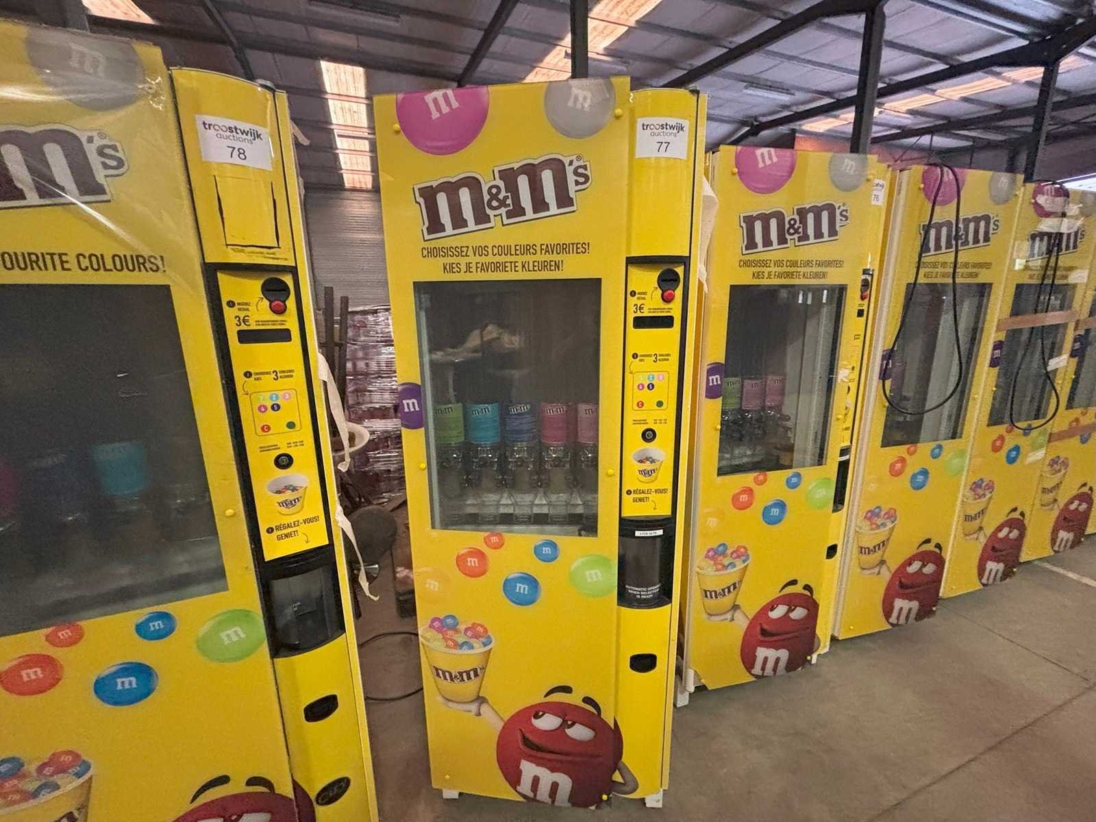 Automaat voor verkoop van M&M's of andere soorten snoep of nootjes in staat waarin toestel zich bevindt Merk: Ducale Model: Bulkvendor Kleur: geel Gewicht: 250kg Lengte: 80cm Breedte: 80cm Hoogte: 183cm