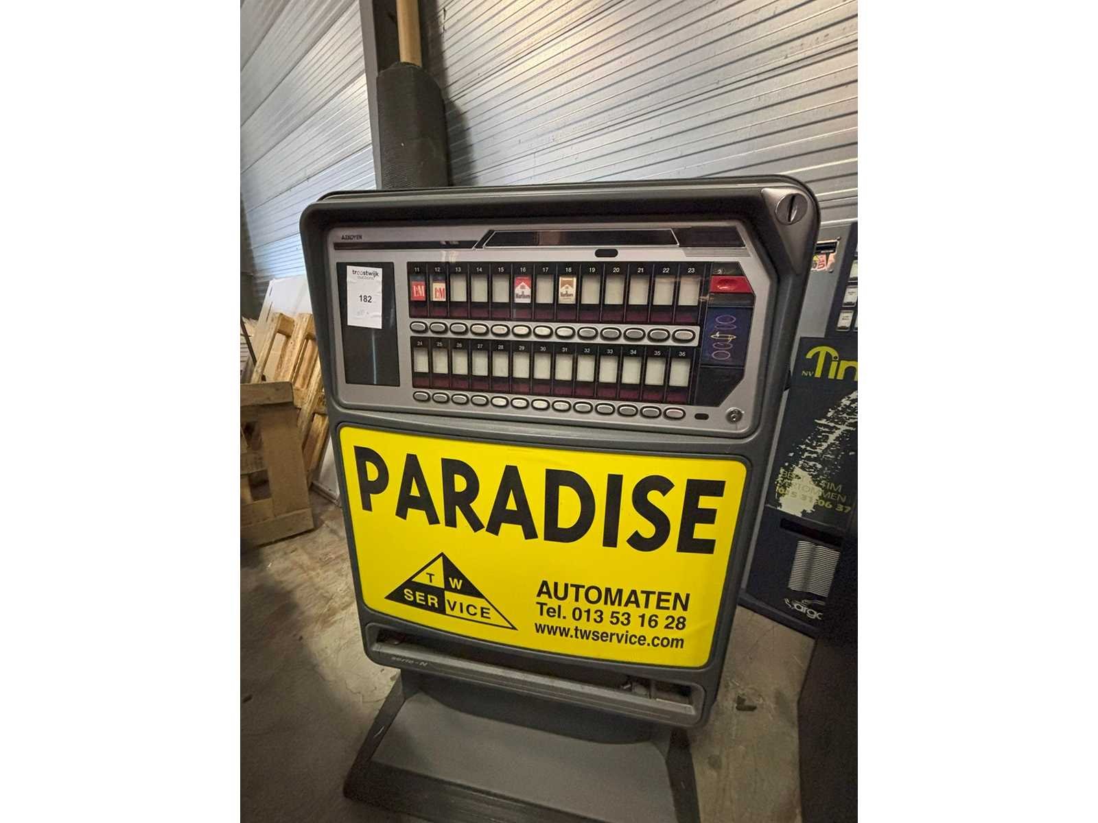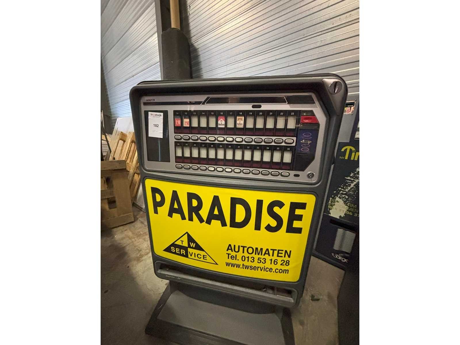 Sigarettenautomaat met biljetlezer in staat waarin toestel zich bevindt Merk: Azkoyen Model: N87 D Gewicht: 150kg Lengte: 100cm Breedte: 40cm Hoogte: 160cm