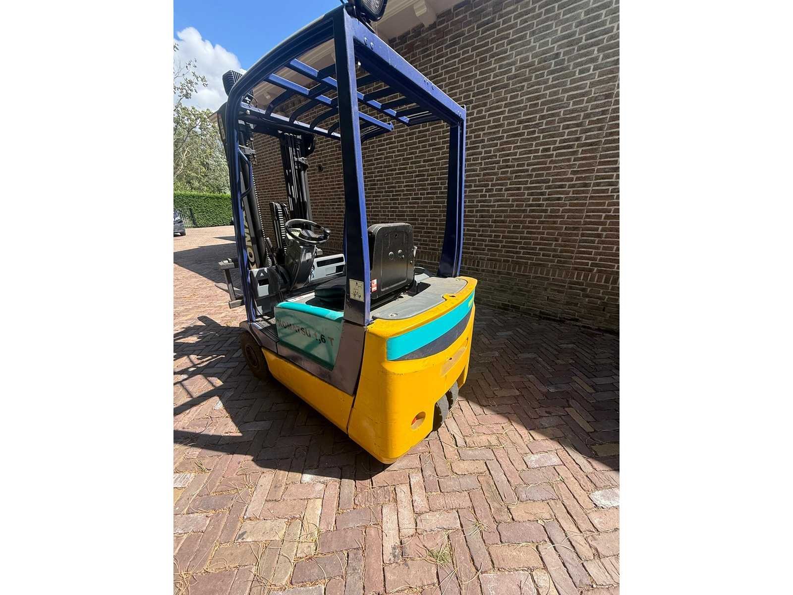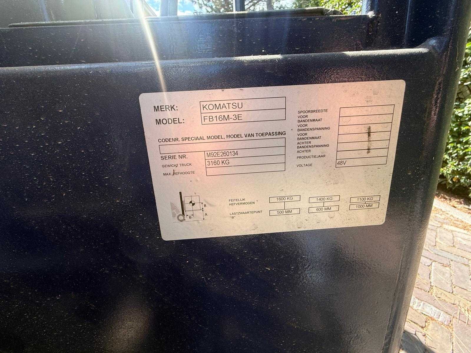 Merk: Komatsu Type: FB16M-3E Serienummer: M92E260134 Brandstof: Electrisch Aantal wielen: 4 Accu lader: true Side-shift: true Eigen gewicht: 3160kg Hefvermogen: 1600kg Vol rubber banden: true