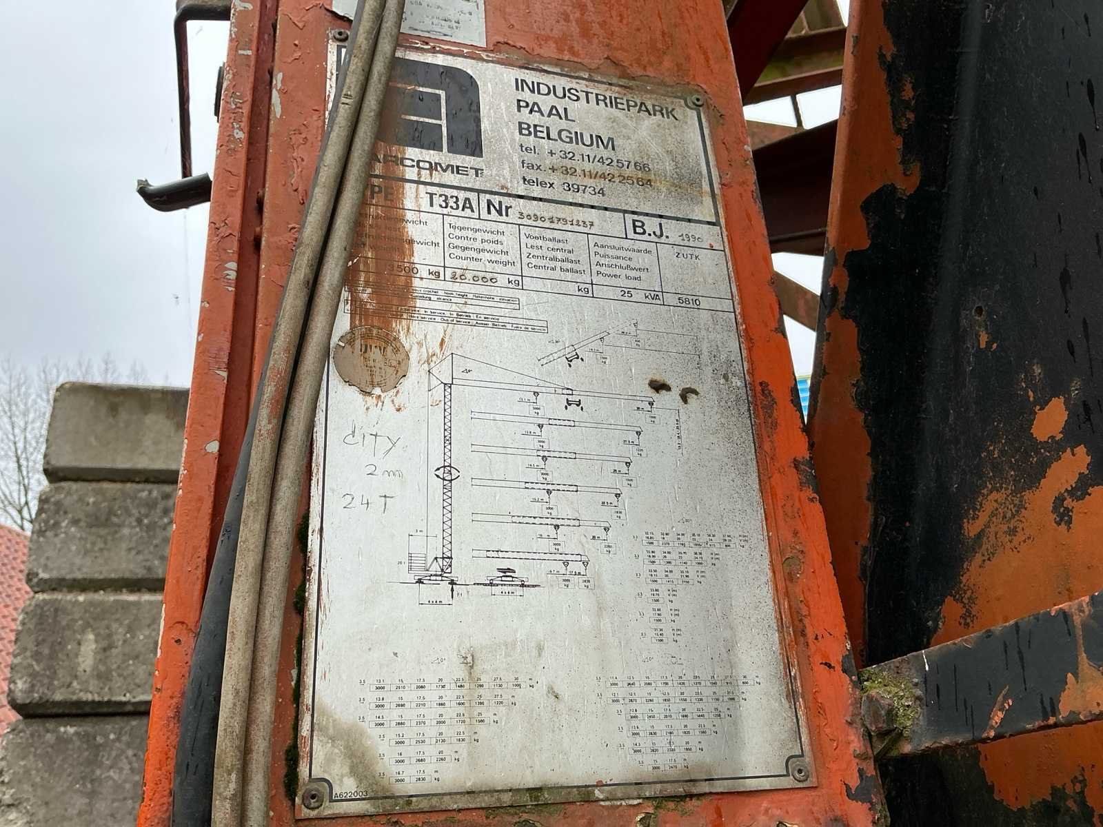 Merk: Arcomet Type: T33A Bouwjaar: 1990 Max. hijscapaciteit: 3000kg Gieklengte: 30m Max. hijshoogte: 23m Met radiografische afstandsbediening: true