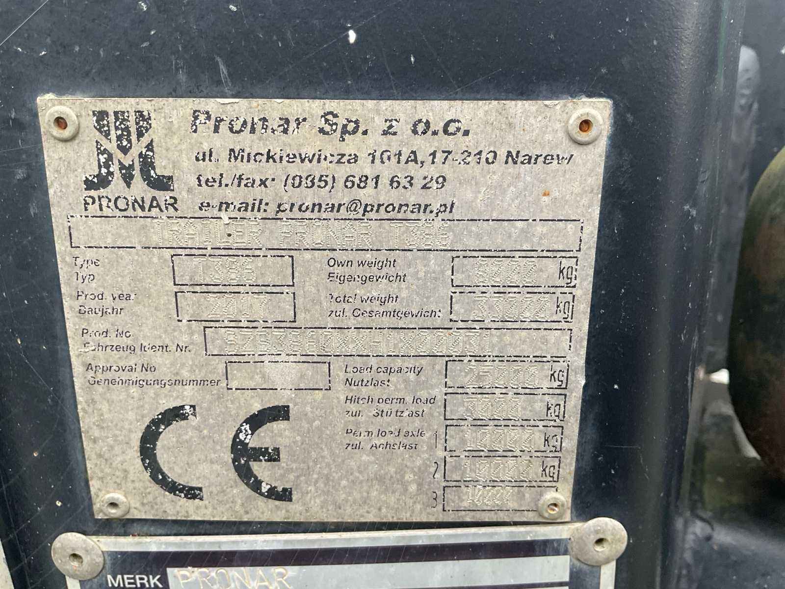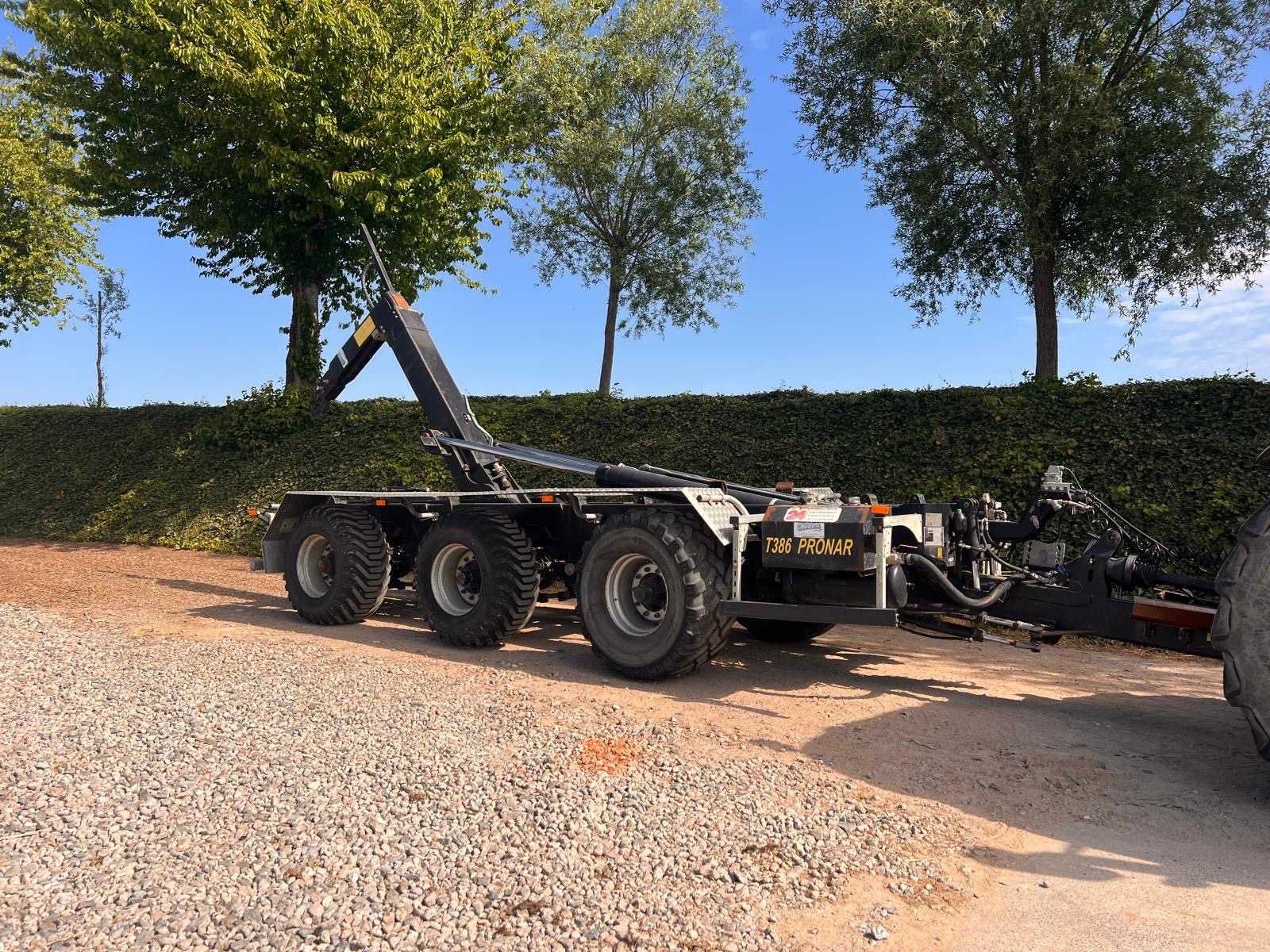 Container niet meegeleverd. Sturing is vastgemaakt maar bij ophaling zal dit stuk eraf zijn zodanig dat de sturing aan de traktor kan aangesloten worden . Papieren/Documenten aanwezig. Systeem werkt zoals het hoort. Merk: Pronar Type: T386 Bouwjaar: 2017 Totaal max. gewicht: 33000t Aantal assen: 3 Luchtdrukremmen: true Hydraulische remmen: false Stuuras: true Eigen gewicht: 8000kg