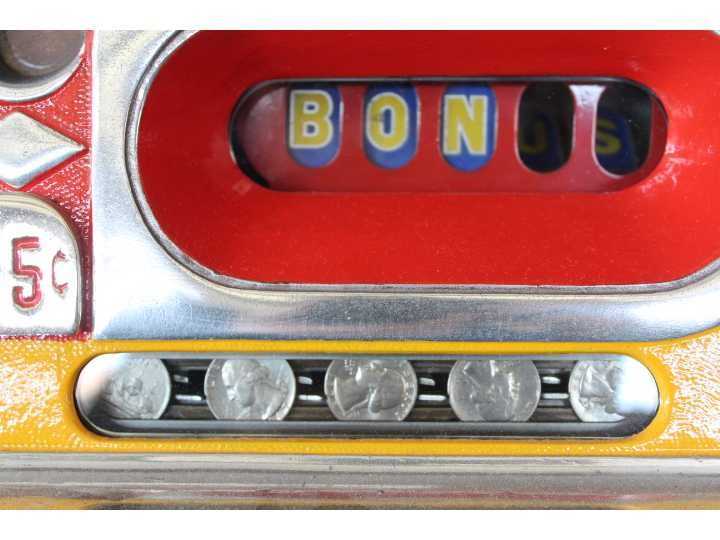 Slotmachine met Bonus systeem, werkt op Amerikaanse Quarters (worden erbij geleverd), slotmachine is geheel gerestaureerd Merk: Mills Type: Horsehead Kleur: Yellow Bouwjaar: 1938