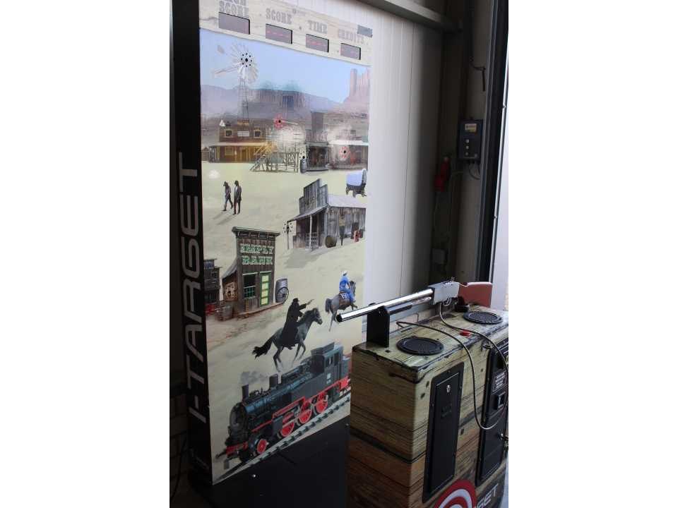 Wild West schietautomaat, werkt op euromunten, met geluidseffecten Merk: Imply Type: I Target Lengte: 221cm Breedte: 91cm Hoogte: 220cm Gewicht: 143kg Bouwjaar: 2009