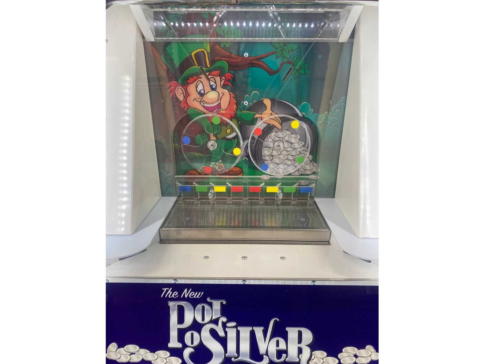 Coinpusher muntenschuiver, inworp met tokens (worden erbij geleverd) LED verlichting Merk: Benchmark Games Type: Pot O Silver Bouwjaar: 2023