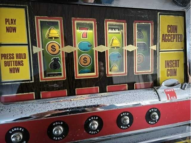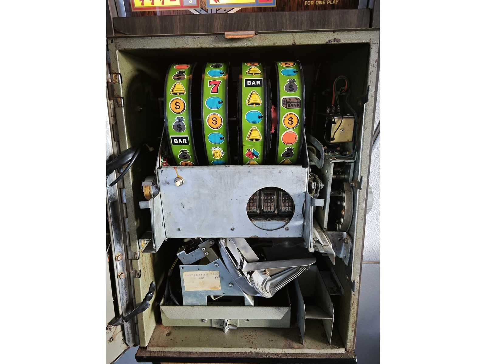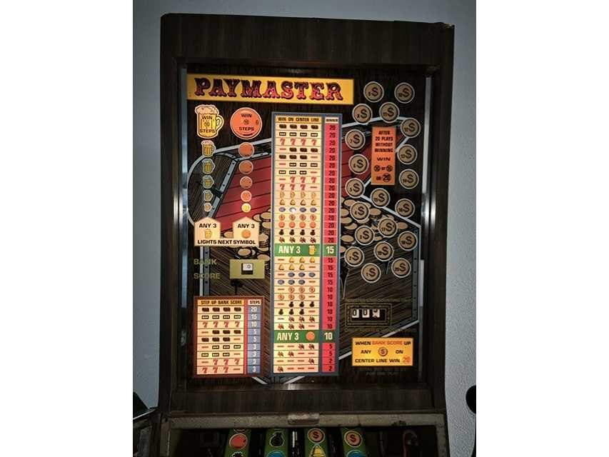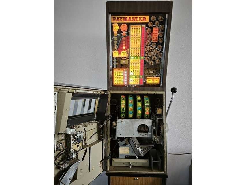 Electro mechanische slotmachine, 4 rollen, accepteert guldens en betaalt deze ook uit (worden erbij geleverd) Merk: Bally Type: Paymaster