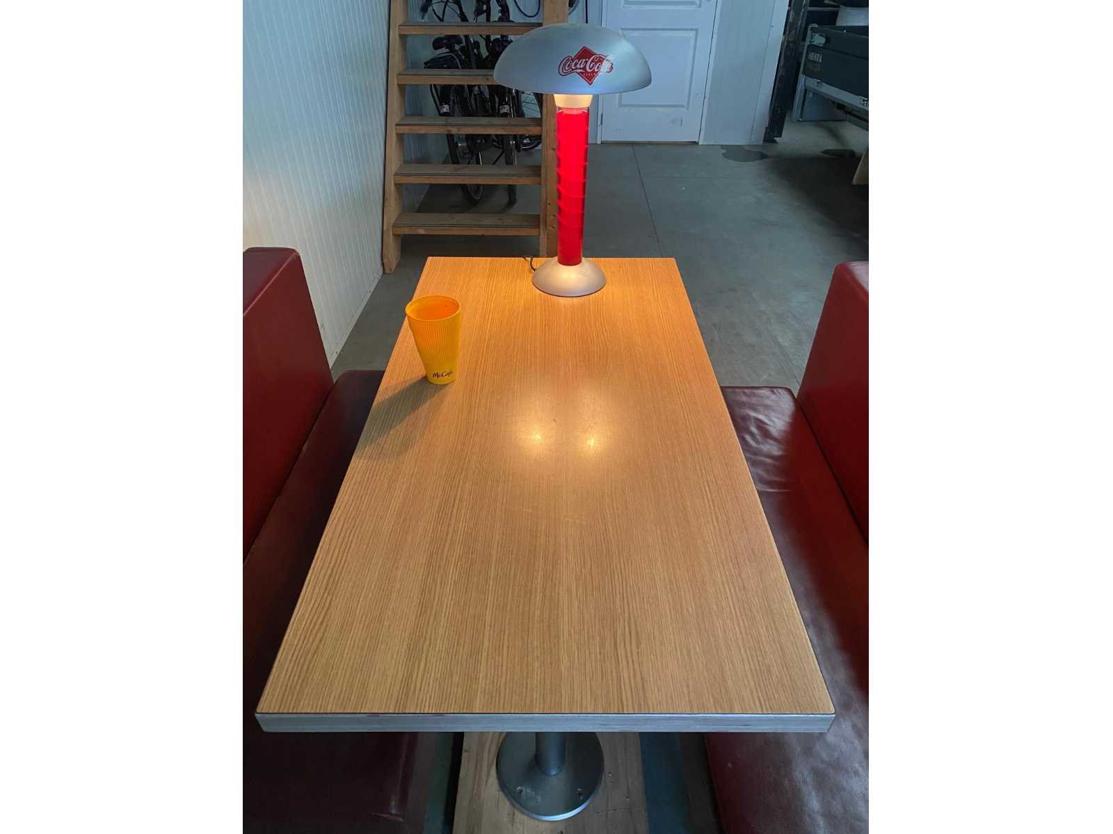 Dinerset afkomstig van McDonalds restaurant jaren 70 van de vorige eeuw, compleet met tafel en tafellampje Merk: McDonalds Kleur: Bordeaux