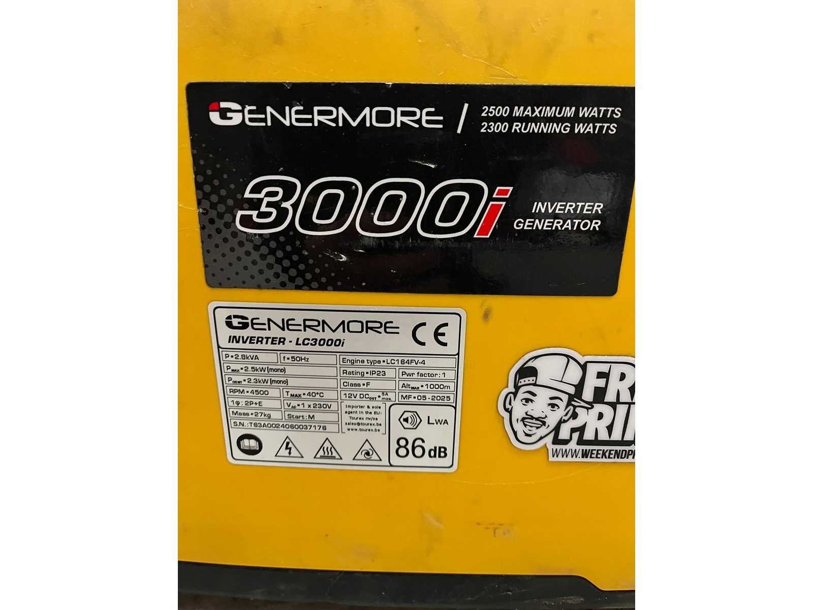 <li>Genermore LC3000I inverter-serie 3,0KVA (2500W) 4,0Pk professional.</li><li> </li><li>Met oliebeveiliging.</li><li> </li><li>Met SMART THROTTLE voor economisch gebruik.</li><li> </li><li>Met 12v gelijkspanning.</li><li> </li><li>Nieuwste generatie verbruiksvriendelijke motor LCPOWER.</li><li> </li><li>Hoogstaande INVERTER technologie FM SPWM.</li><li> </li><li>Voldoet aan de laatste nieuwe Emissienormen EPA3.</li><li> </li> Merk: Genermore Type: LC3000i Bouwjaar: 2024 Serienummer: T63A0024060037178 Eigen gewicht: 27kg