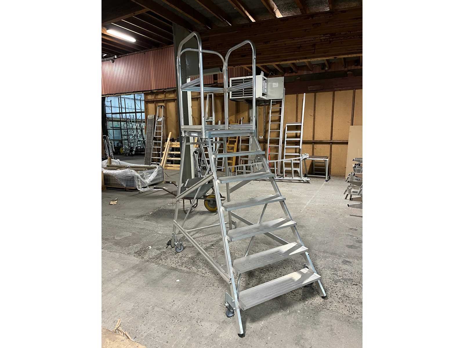 <li>Professionele aluminium magazijntrap met platform, TÜV-gecertificeerd. Voorzien van wielen voor eenvoudig verplaatsen, veiligheidsbeugels en antislip treden. Ideaal voor veilig werken op hoogte in magazijn of werkplaats.</li><li> </li><li> </li><li>Technische specificaties (Munk 50107):</li><li> </li><li> </li><li>Merk / Artikelnummer: Munk 50107</li><li> </li><li>Type: Enkelzijdige platformtrap op wielen</li><li> </li><li>Materiaal: Aluminium, antislip R9</li><li> </li><li>Aantal treden: 7</li><li> </li><li>Platformafmeting: 600 × 800 mm</li><li> </li><li>Platformhoogte: ca. 1.680 mm</li><li> </li><li>Werkhoogte: ca. 3.680 mm</li><li> </li><li>Totale hoogte: ca. 2.680 mm</li><li> </li><li>Basisafmeting: 1.060 × 1.870 mm</li><li> </li><li>Traphoek: 70°</li><li> </li><li>Trede diepte: 200 mm</li><li> </li><li>Tussenruimte treden: 235 mm</li><li> </li><li>Wielen: 4 zelfarretierende rollen Ø125 mm (2 met rem)</li><li> </li><li>Maximale belasting: 150 kg</li><li> </li><li>Gewicht: ca. 44 kg</li><li></li> Leveringsvoorwaarden: Gratis op vrachtwagen
