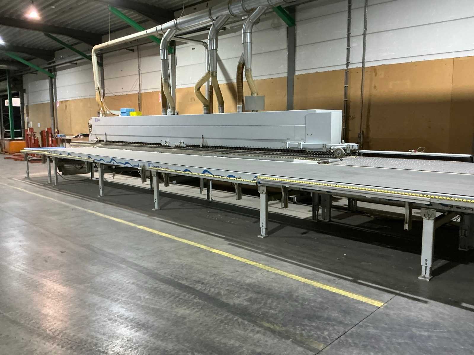 Lijmsysteem PUR; Voorzien van Ligmatech rollerbaan en transportbaan; blaastafel Ligmatech Optimat ZHR05 Merk: Homag Type: Optimat KAL310 Bouwjaar: 2004 Serienummer: 0-200-11-6606 Paneeldikte: 20mm Kantbanddikte: 3mm Kantenbandhoogte: 65mm Voorfreesunit: true Schraapunit: true Aansluiting: 400V Afmeting l: 6680mm Afmeting b: 1000mm Afmeting h: 1750mm