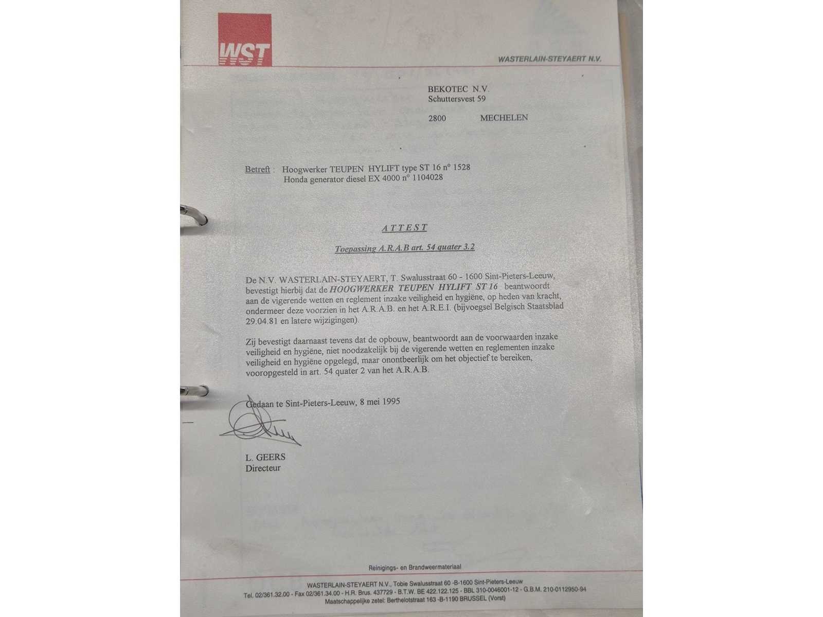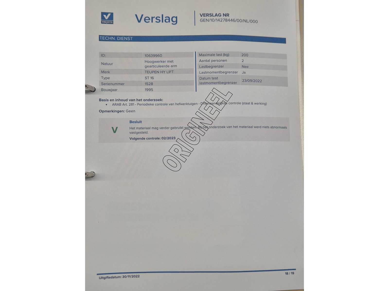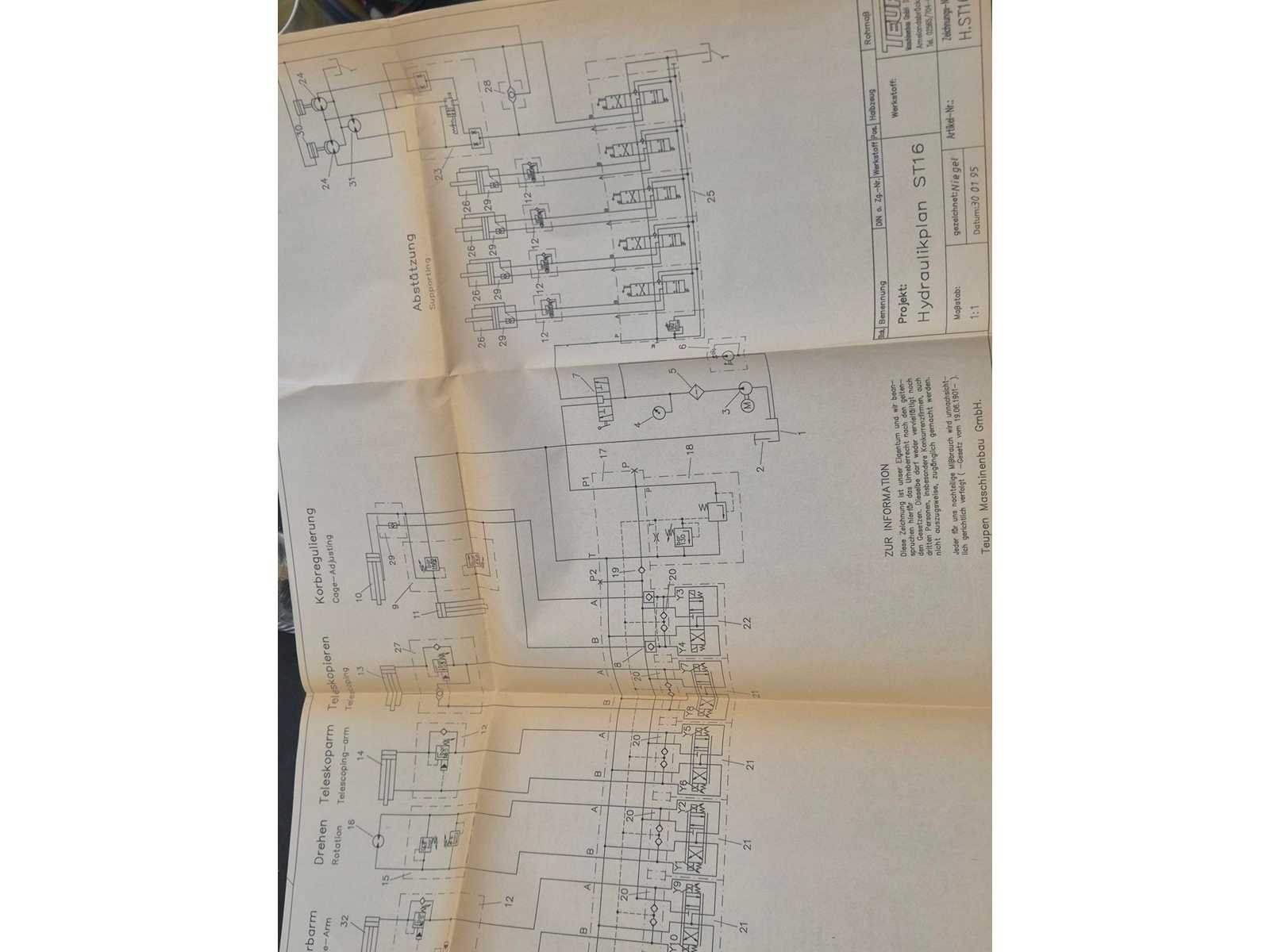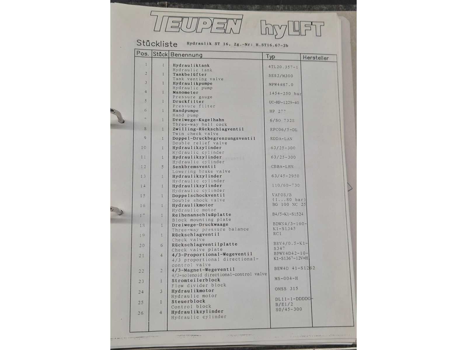 Werkhoogte 16 meter, voorzien van hydraulische beweegbare voeten, kan op ongelijke ondergrond geplaatst worden aangedreven benzine/electrisch, rijdt hydraulisch op de drie wielen aangedreven. Voorzien van 4 kuststof steunpootplaten. Keuringsattesten, attest van inbedrijfsstelling en handleidingen aanwezig. Merk: Teupen Type: Hylift ST 16 Bouwjaar: 1995 Telescoop hoogwerker: true Werkhoogte: 16450mm Plateau afm. l: 900mm Plateau afm. b: 800mm Platform capaciteit: 200kg Eigen gewicht: 2150kg Totale afmeting Breedte: 940mm Totale afmeting Hoogte: 1980mm
