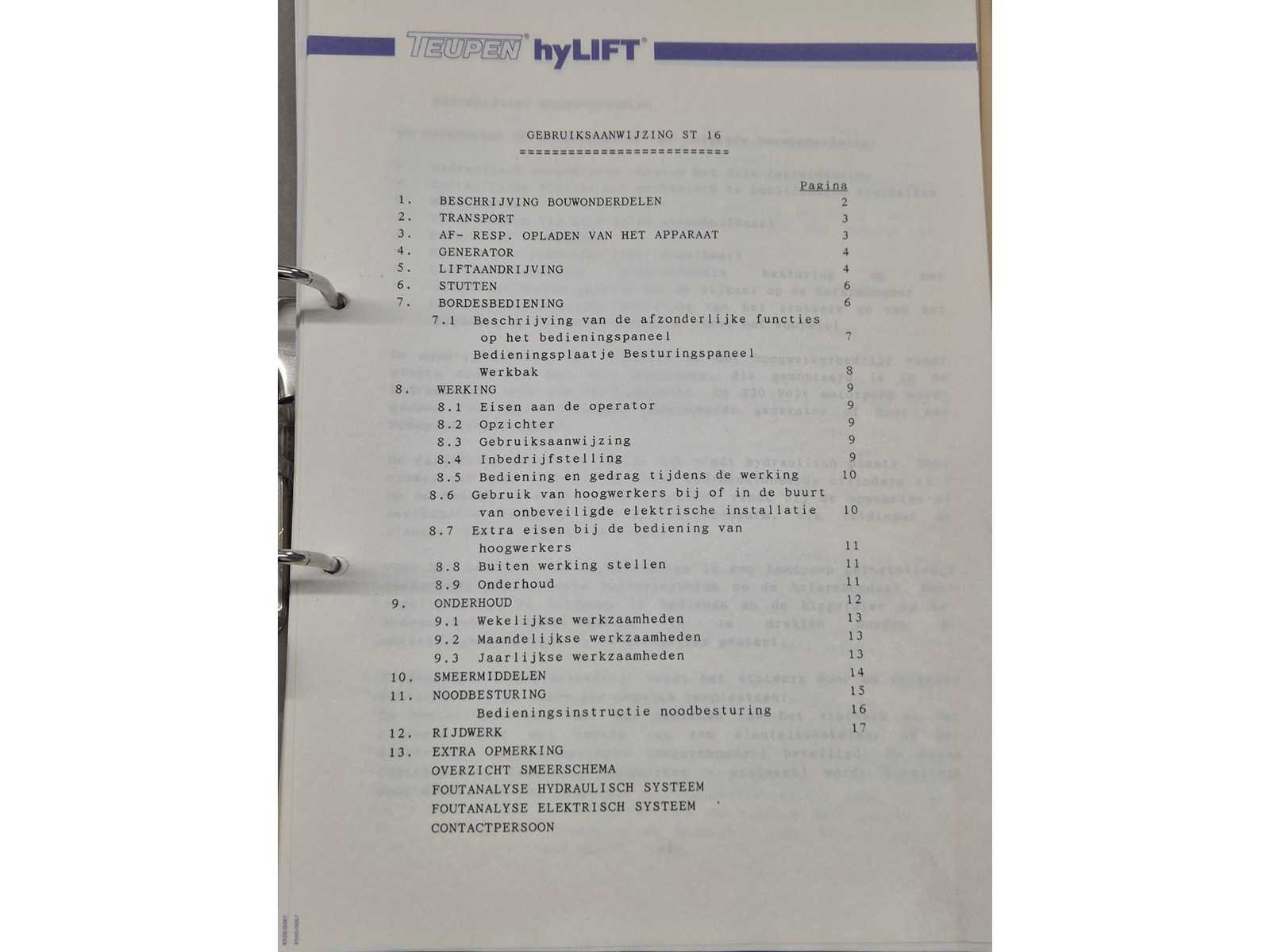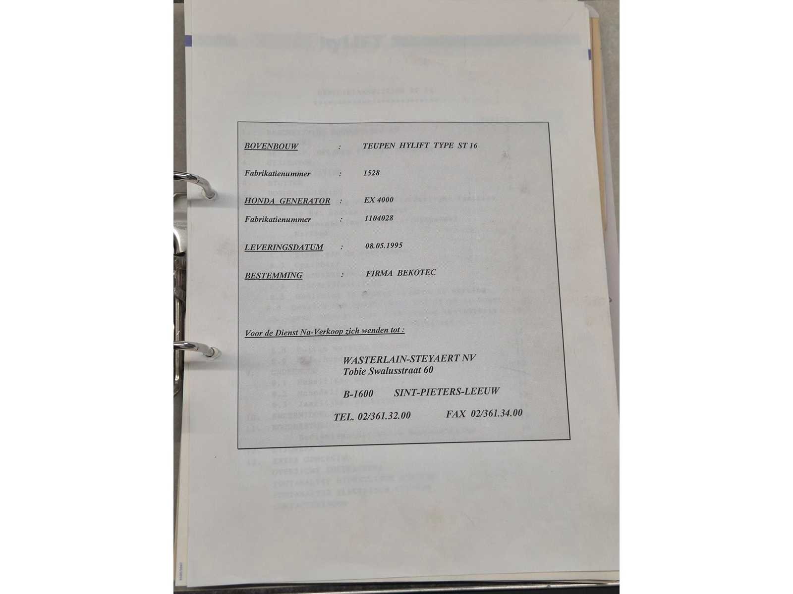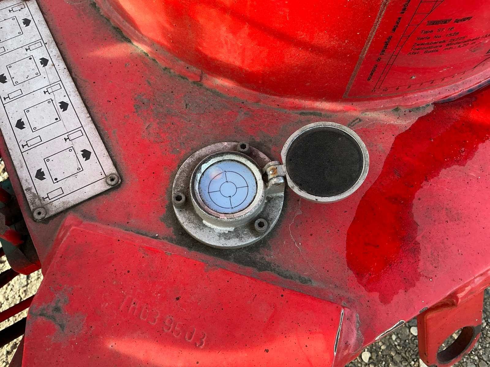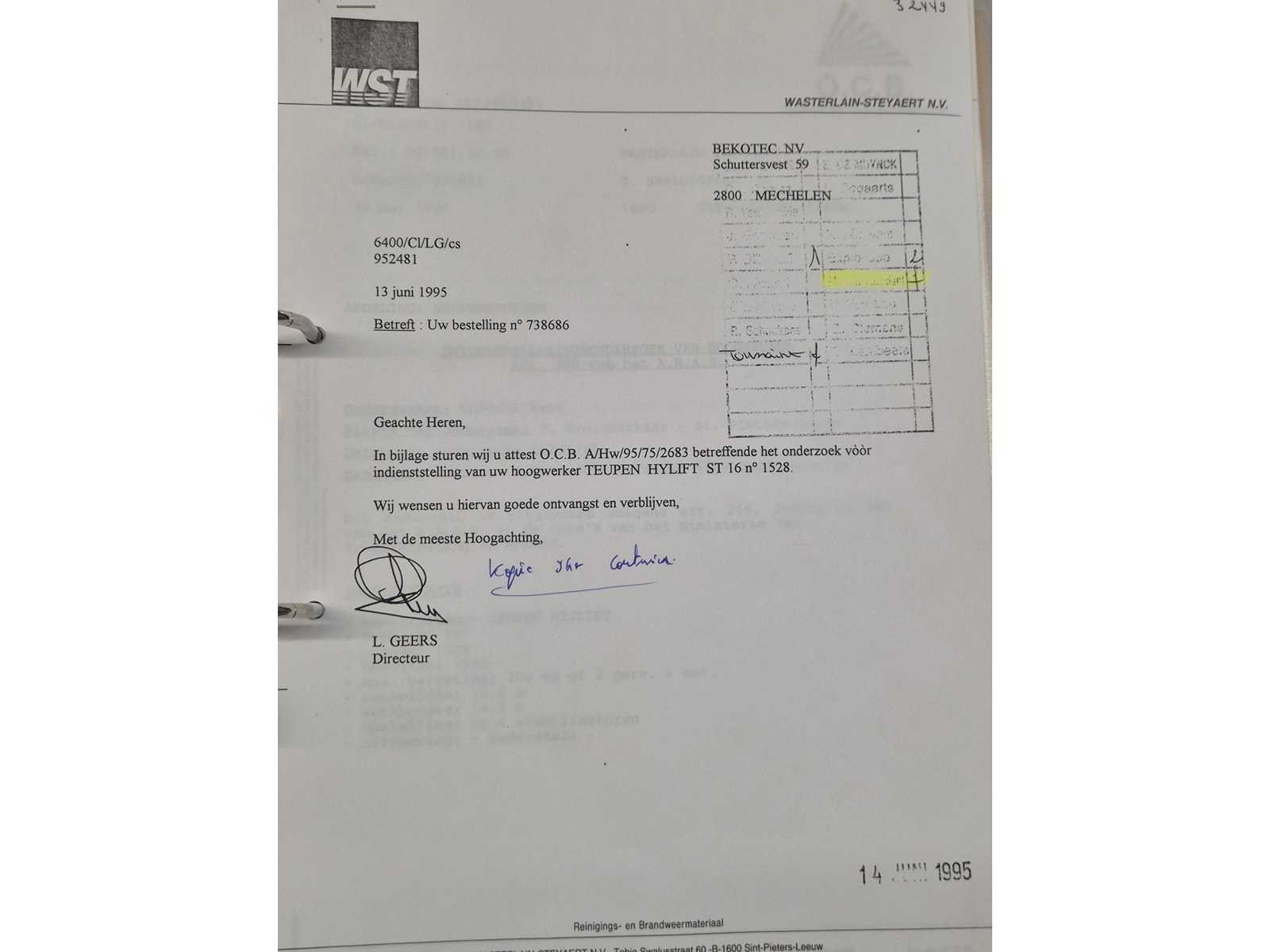 Werkhoogte 16 meter, voorzien van hydraulische beweegbare voeten, kan op ongelijke ondergrond geplaatst worden aangedreven benzine/electrisch, rijdt hydraulisch op de drie wielen aangedreven. Voorzien van 4 kuststof steunpootplaten. Keuringsattesten, attest van inbedrijfsstelling en handleidingen aanwezig. Merk: Teupen Type: Hylift ST 16 Bouwjaar: 1995 Telescoop hoogwerker: true Werkhoogte: 16450mm Plateau afm. l: 900mm Plateau afm. b: 800mm Platform capaciteit: 200kg Eigen gewicht: 2150kg Totale afmeting Breedte: 940mm Totale afmeting Hoogte: 1980mm