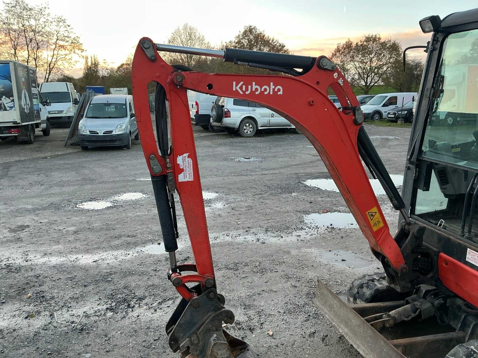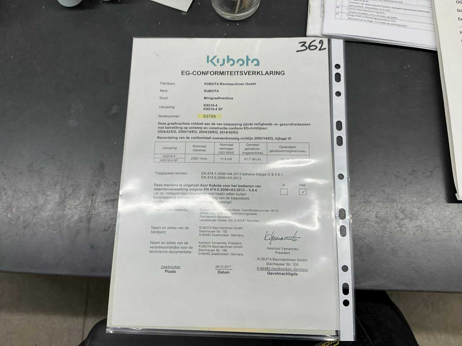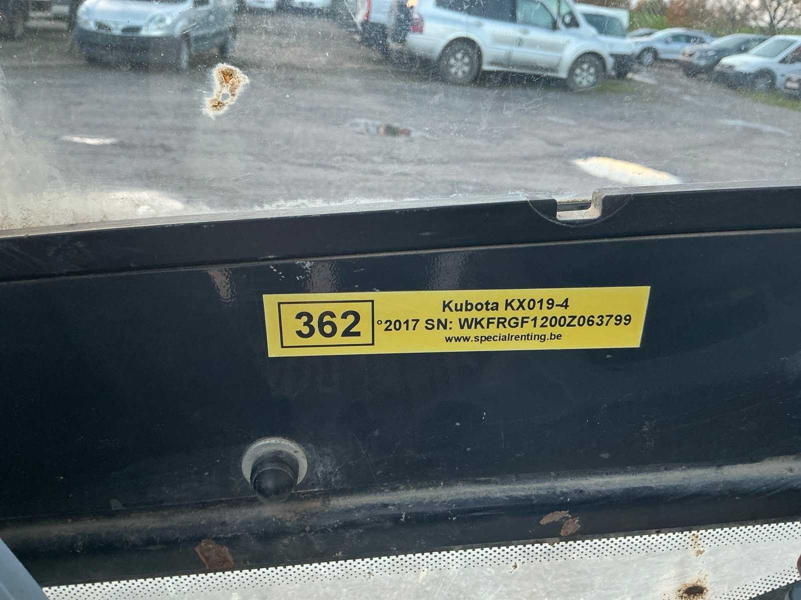 Voorzien van hydraulische spoorverbreding. Met boorddocumenten. Gelijkvormigheidsattest. Kentekenbewijs Deel 1 en 2 Merk: Kubota Type: KX019-4 Bouwjaar: 2017 Serienummer: WKFRGF1200Z063799 Merk motor: Kubota Motorvermogen (kW): 11.8kW Aantal cilinders: 3 Brandstof: Diesel Met graafbak: true Graafbak afm. l: 470mm Graafbak afm. b: 440mm Graafbak afm. h: 520mm Rups breedte: 240mm Cabine: true Afgelezen urenstand: 3593 Totale afmeting L: 3400mm Totale afmeting Breedte: 1150mm Totale afmeting Hoogte: 2250mm